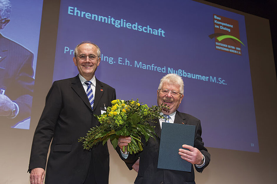 In der Verleihungsurkunde heißt es: »Als Vorsitzender des DBV, als Bauingenieur und als Unternehmer hat er erkannt, dass verlässliche Rahmenbedingungen unerlässlich sind, um erfolgreich bauen zu können. Und zu solchen Rahmenbedingungen gehören auch praxisgerechte Normen.« Mit dieser Überzeugung habe Nußbaumer für die Gründung der Initiative »Praxisgerechte Regelwerke im Bauwesen« (Initiative PRB) geworben und sie vollendet. »Die Initiative PRB setzt das Leitmotiv des DBV, nämlich: »Bau-Kompetenz im Dialog« in pränormativer Forschung und durch branchenübergreifenden Austausch in hervorragender Weise um. Er hat damit höchst erfolgreich die Ziele des DBV verwirklicht und zum Ansehen des Vereins beigetragen«, so die Urkunde weiter. Mit der Ehrenmitgliedschaft des DBV werden seit dem Jahr 1919 diejenigen Persönlichkeiten von der Mitgliederversammlung ausgezeichnet, die sich um den Verein besonders verdient gemacht haben.