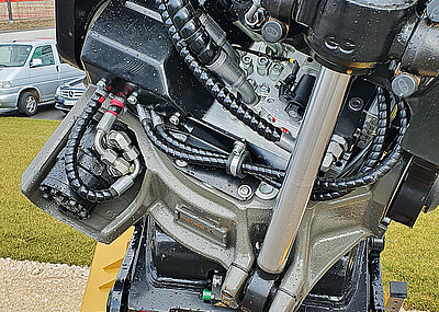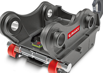 Eine weitere Innovation stellt die Kombination aus mechanischer Fallsicherung und »OQLI«-System mit »e-VA«-Sichtanzeige bei Schnellwechslern dar: Die bewegliche Fangvorrichtung verlängert die Schnellwechsler-Klaue, die sich um die Welle an der Adaption des Anbaugeräts schließt. Auf diese Weise wird verhindert, dass Anbaugeräte herunterfallen können. Bei der Verriegelungsanzeige »e-VA« handelt es sich wiederum um die elektronische Variante der OilQuick-Sichtanzeige »MRL«: Statt eines mechanischen Stiftes zeigt ein grünes LED-Leuchtband am Schnellwechsler den Verriegelungszustand an.
