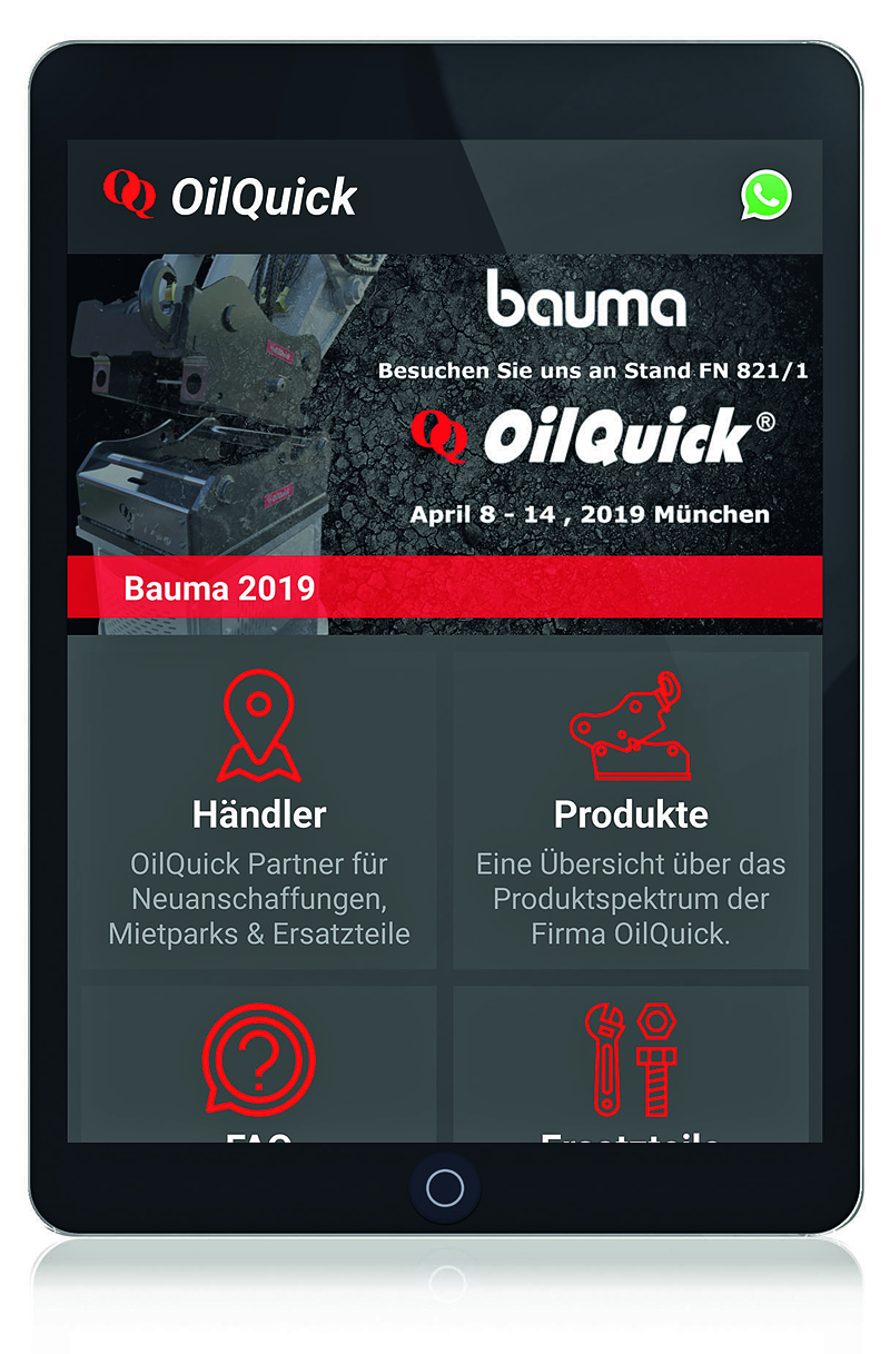 Zeit ist auf Baustellen eine knappe Ressource. OilQuick reagiert auf die steigenden Effizienzanforderungen mit einer App für Smartphones und Tablets, ausgerichtet auf Maschinenführer und Servicepersonal. Die App soll Schluss mit gedruckten Bedienungsanleitungen oder der Zettelwirtschaft für Servicenummern und Wartungslisten machen. Highlight ist der digitale Wartungsplan, der Maschinenführer an anstehende Aufgaben erinnert und mit einer ausführlichen Checkliste unterstützt. Jede Wartungseinheit wird abgehakt und in der Wartungshistorie archiviert. Dank intuitiver Navigation lassen sich in Sekundenschnelle die nächstgelegenen OilQuick-Händler recherchieren, Ersatzteile auswählen und als Favoriten speichern. Bei offenen Fragen helfen Video-Tutorials, digitale Anleitungen oder ein WhatsApp-Chat mit den OilQuick-Servicemitarbeitern. §