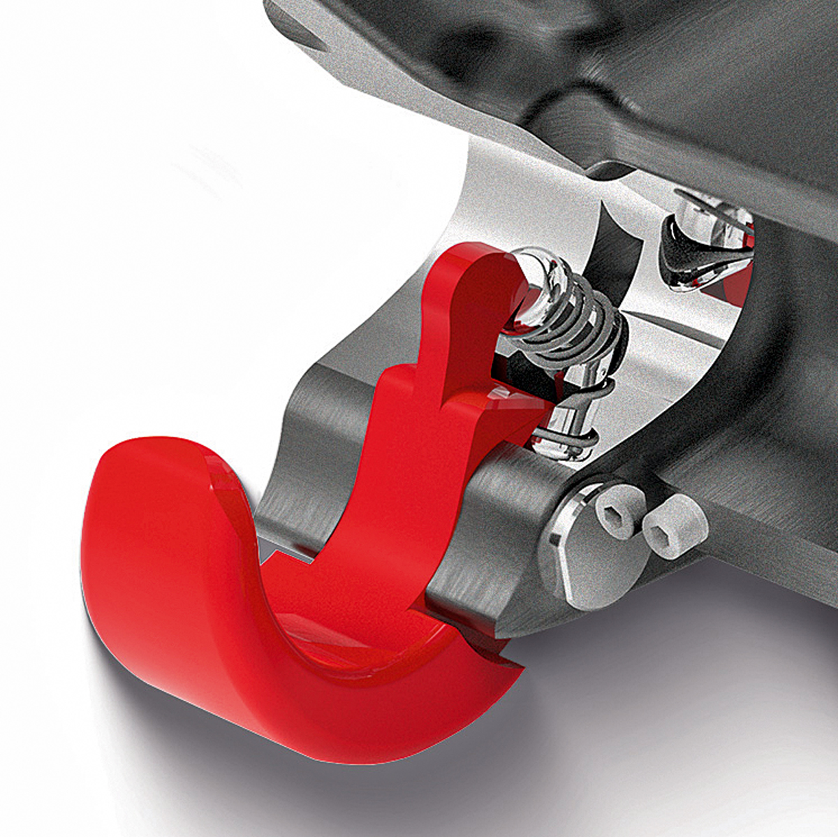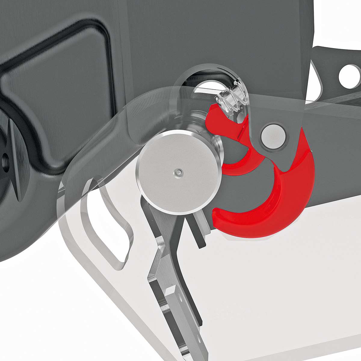 Der neue Feder-Mechanismus hält die Fallsicherung auch bei ungünstigen Winkeln zum Einkuppeln offen und drückt sie zum Auskuppeln auf, sobald das Anbaugerät abgelegt wird. So soll das Ein- und Auskuppeln noch einfacher werden. Darüber hinaus werden durch die innen liegende Position und eine Bolzensicherung mit Sicherungsschraube Beschädigungen vermieden – selbst bei Schiebemanövern mit den Schnellwechsler-Flanken.