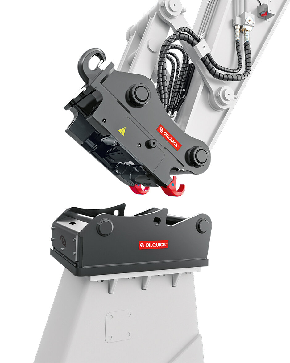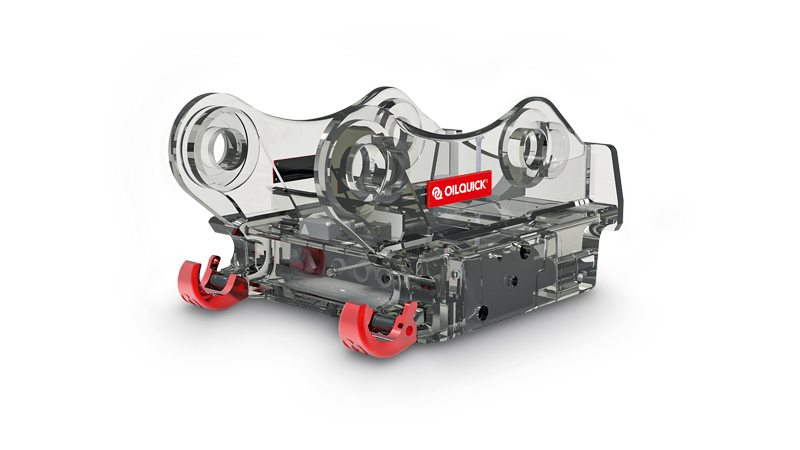 Bei der Fallsicherung wird das Anbaugerät beim Aufnehmen durch zwei zusätzliche rote Klauen gesichert, die sich um die Welle an der Adaption des Anbaugeräts schließen und dieses im Notfall auffangen können. Somit wird verhindert, dass sich ein fehlerhaft aufgenommenes oder versehentlich geöffnetes Gerät löst und in die Tiefe stürzt. Das Besondere an der OilQuick-Fallsicherung ist laut Hersteller, dass sie in sämtlichen Notfallsituationen eingreift, etwa wenn der Schließvorgang gar nicht eingeleitet wurde. Ein nicht eingeleitetes Schließen zählt zu den häufigsten Unfallursachen. Darüber hinaus sind bei der Fallsicherung keine externen Ansteuerungen oder komplizierten Kinematiken erforderlich. Sie ist also automatisch in der Bedienung und einfach in der Wartung.