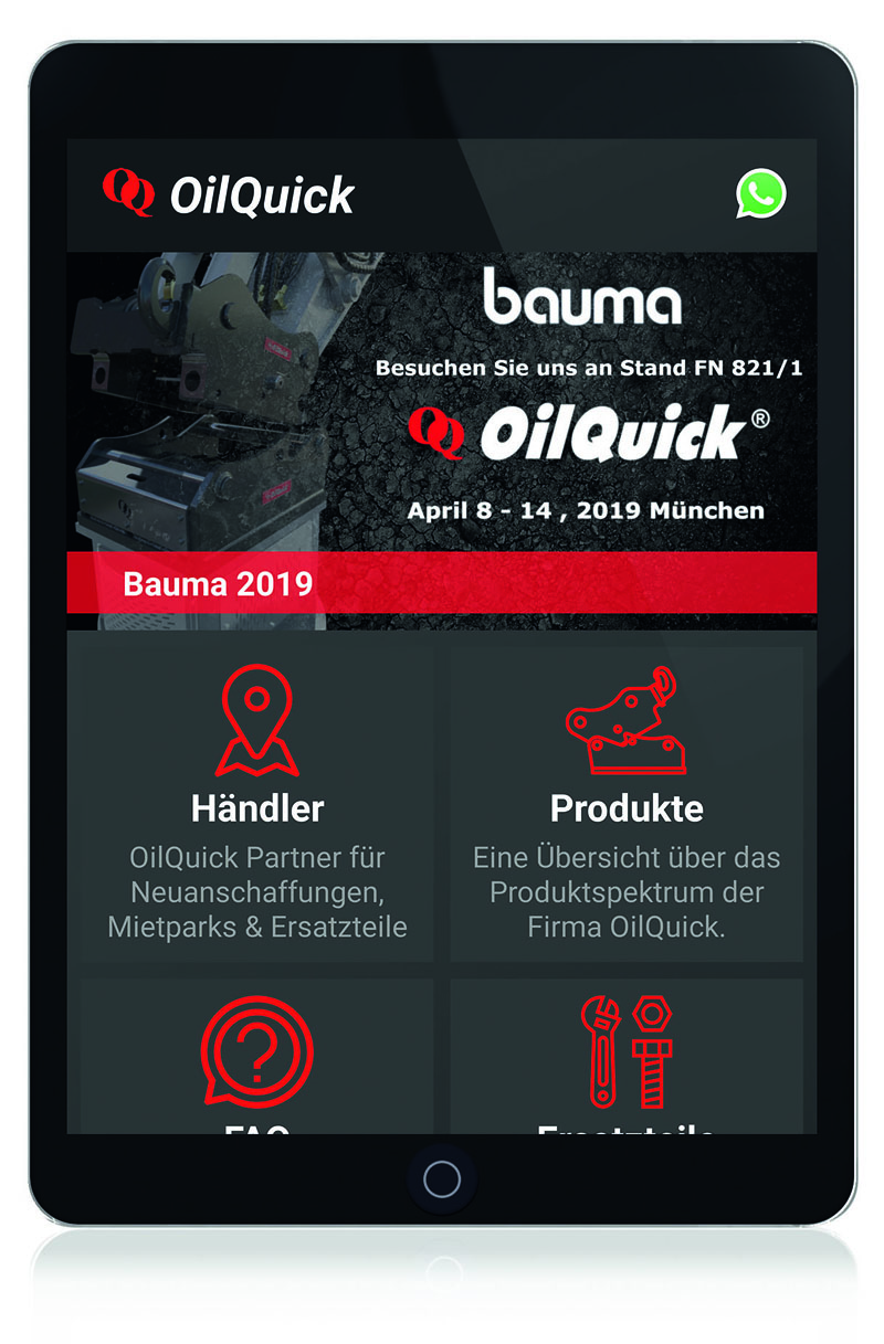 Zeit ist auf Baustellen eine knappe Ressource. OilQuick reagiert auf die steigenden Effizienzanforderungen mit einer durchdachten App für Smartphones und Tablets: Prall gefüllt mit praxisnahen Services wird der digitale Helfer zum täglichen Begleiter von Maschinenführern und Servicepersonal. Die OilQuick App macht Schluss mit gedruckten Bedienungsanleitungen und der Zettelwirtschaft für Servicenummern und Wartungslisten. Highlight ist der digitale Wartungsplan, der Maschinenführer an anstehende Aufgaben erinnert und mit einer ausführlichen Checkliste unterstützt. Jede Wartungseinheit wird abgehakt und in der Wartungshistorie archiviert. Dank der intuitiven Navigation lassen sich in Sekundenschnelle die nächstgelegenen OilQuick-Händler recherchieren, Ersatzteile auswählen und als Favoriten speichern. Bei offenen Fragen helfen Video-Tutorials, digitale Anleitungen oder ein WhatsApp-Chat mit den OilQuick-Servicemitarbeitern.