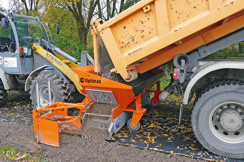 Im Einsatz ist in der ostwestfälischen Stadt eine Finliner-Materialverteilschaufel mit einem Fassungsvermögen von 1,4 m³. Sie bietet eine Einfüllbreite von 2,6 m bei einer Höhe der Vorderkante von 0,85 m. Ein Lkw kann also direkt an den Materialbehälter heranfahren und ihn befüllen. Das Gewicht der Finliner wird durch vier Vollgummischwerlasträder während der Fahrt getragen. Das Optimas-Anbaugerät kann an übliche 5-t-Radlader montiert werden. Das Verfüllgut wird mittels hydraulisch bewegbarem und 2,5 m langem Förderband nach außen transportiert. Die Dosierung des Füllguts wird durch die Förderbandgeschwindigkeit und die Fahrgeschwindigkeit des Radladers gesteuert. Der Finliner hat ein Eigengewicht von 1 100 kg.