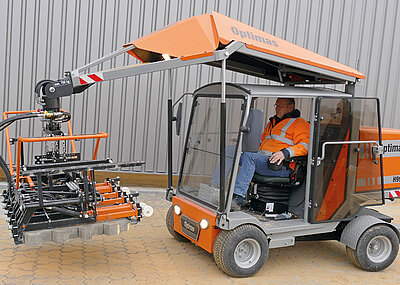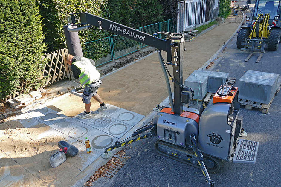 Zu den Optimas-Maschinen in seinem Unternehmen zählen eine Verlegemaschine T 22, ein Vacu-Pallet-Mobil und ein Vacu-Mobil-Allrounder. Schaut man den Fachleuten beim Verlegen zu, kann man vergessen, dass Betonplatten mit einem Gewicht von 40 kg bis 60 kg verlegt werden. Es scheint eher, als würden die Schwergewichte schwerelos an den richtigen Platz gelegt werden. Zumal hochkant stehende Platten angesaugt und mittels eines Gelenks automatisch in die waagrechte Position gleiten.