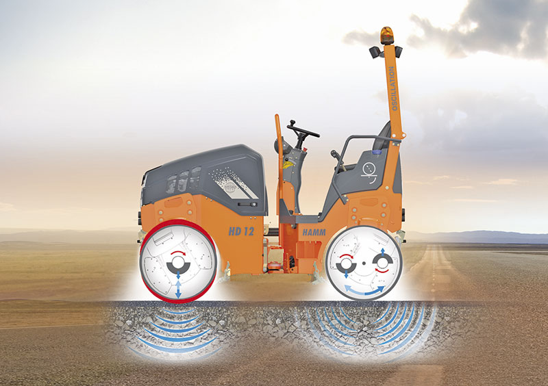 Rund 30 Jahre, nachdem Hamm mit den ersten Oszillationswalzen die Verdichtungstechnik veränderte, hält diese intelligente Technologie auch in der Gewichtsklasse bis 4,5 t Einzug bei Hamm – mit vier Modellen mit Oszillationsbandage, zu erkennen am »O« im Namen: HD 10 VO (2,6 t), HD 12 VO (2,8 t), HD 13 VO (4 t), HD 14 VO (4,4 t). Die Oszillation erzielt eine sehr schnelle Verdichtungszunahme, denn die Bandagen leiten tangentiale Schubkräfte in das zu verdichtende Material ein, dabei bleiben sie ständig in Kontakt mit dem Boden. Die Kombination aus kontinuierlich wirkender statischer Auflast und den wechselnden dynamischen Scherkräften im Material bewirken eine schnellere, bessere und schonendere Verdichtung. Außerdem passen sich die Amplitude und damit die Verdichtungsleistung automatisch an die vorhandene Steifigkeit an. Im Gegensatz zu den Lösungen anderer Hersteller erzielt Hamm als einziger diesen Effekt ohne teure Elektronik, sondern nutzt stattdessen die physikalischen Gesetze intelligent aus.