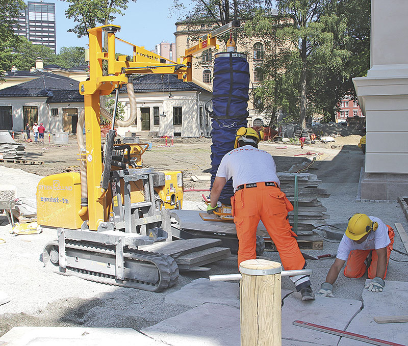www.youtube.com/watch einer Fläche von 1 700 m² wurden Slate-Natursteine mit einem Gewicht von je 150 bis 200 kg verlegt. Zur Erleichterung der Arbeit kam dabei der Verlegetransporter Transmobil TM von Probst zum Einsatz. Mit der Vakuum-Verlegeeinheit können Bordsteine, Platten und Bauelemente in einem Arbeitsgang transportiert, von der Palette angehoben und exakt verlegt werden. Die hohe Tragfähigkeit des Verlegetransporters von 200 kg bei voller Ausladung und 250 kg bei verminderter Ausladung erlaubt auch bei schweren Produkten ergonomisch entlastende und wirtschaftliche Arbeit.Die Verlegegeschwindigkeit mit dem Transmobil TM ist nach Herstellerangaben bis zu fünfmal höher als bei manueller Verlegung. Das Baustoffpaket wird auf dem Verlegetransporter direkt mitgeführt, so erfolgt die Verlegung mit Vakuumpower kraftsparend und zügig und kann von einer Person ausgeführt werden. Der am Ausleger angebrachte Vakuum-Schlauchheber hebt auch Baustoffe mit rauer Oberfläche an und ermöglicht eine Verlegung ohne Beschädigungsrisiko. Das Modell TM-150-D-XL wird von einem geräuschgedämmten Hatz-Silent-Pack-Dieselmotor angetrieben, so konnten die Vorlesungen an der Universität Oslo ohne störenden Geräuschpegel während der Bauarbeiten weiterlaufen.