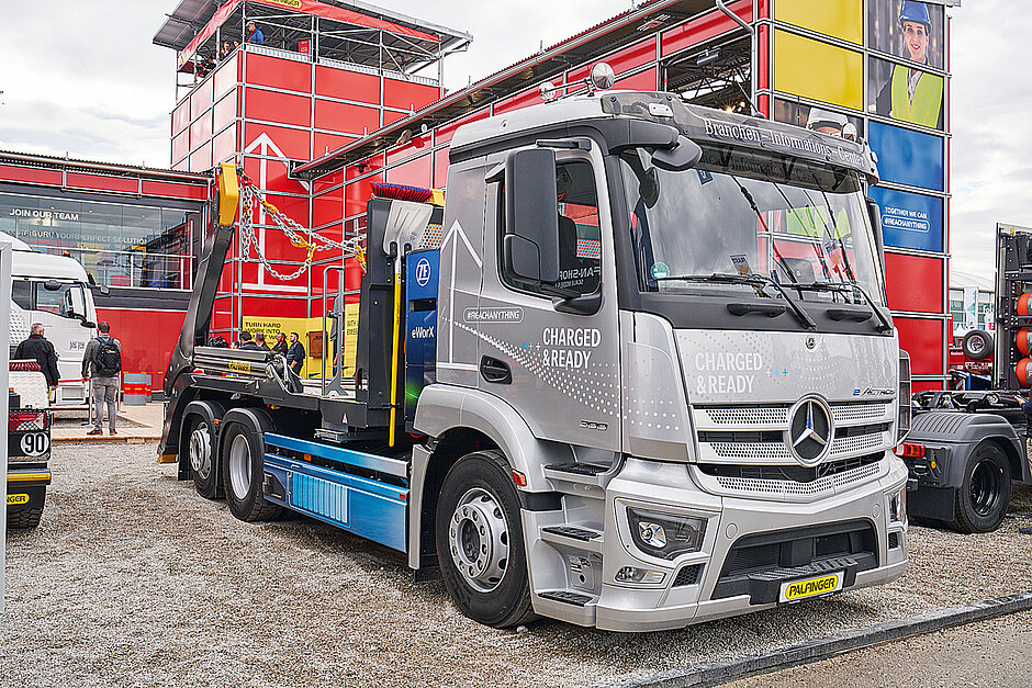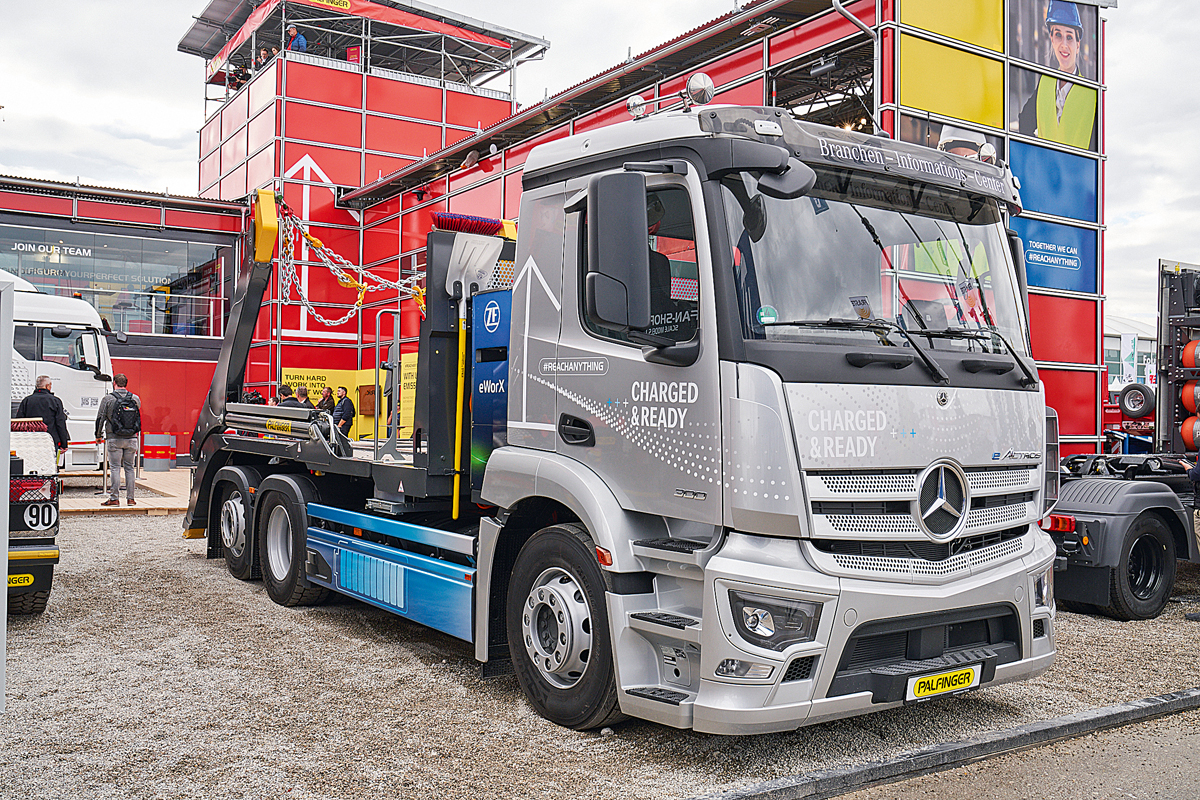 Auch das eWorX-Modul, das die Elektrifizierung der gesamten Palfinger-Produktpalette ermöglicht, war zu sehen. In Zusammenarbeit mit ZF Friedrichshafen und Mercedes-Benz Trucks entwickelt, bildet das Modul die Schnittstelle für Kommunikation und Energie zwischen eLkw und Fahrzeugaufbauten. Die Energiequelle des Nutzfahrzeugs wird durch das ZF eWorX Modul in mechanische Energie umgewandelt und so für die Palfinger-Hebelösung nutzbar. Auf der Bauma wurde das Modul in Verbindung mit dem Mercedes-Benz eActros und dem Absetzkipper PST 18 präsentiert (das bauMAGAZIN berichtete in Heft 9/22, Seite 206). t