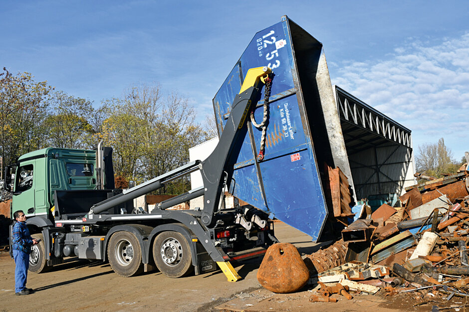 Dank des permanenten Dialogs der Vertriebsspezialisten mit den Kunden, kennt Palfinger deren Anforderungen und Bedürfnisse. Auf dieser Basis wurde auch dem Kölner Recycling-Profi die Investition in ein Gerät der neuesten Generation empfohlen. Auf einem Dreiachs-Chassis wurde der Absetzkipper PS T18 TEC mit Dreifach-Kipphaken und hydraulischer Behälterverriegelung verbaut. Giuseppe Di Mauro, Stammfahrer des Palfinger-Absetzkippers, ist seit zehn Jahren beim Kölner Entsorgungsbetrieb beschäftigt und schätzt die Bedienerfreundlichkeit und Sicherheit des neuen Palfinger-Geräts: »Das Handling ist ok, er ist schneller als sein Vorgänger und ich kann alle Funktionen auch mit der intuitiven Funkfernsteuerung nutzen. Der Absetzkipper lässt sich genauso bewegen, wie es meine Arbeit gerade erfordert.«