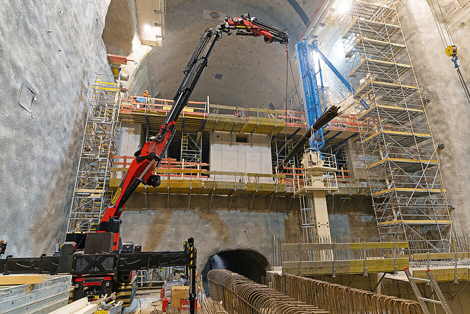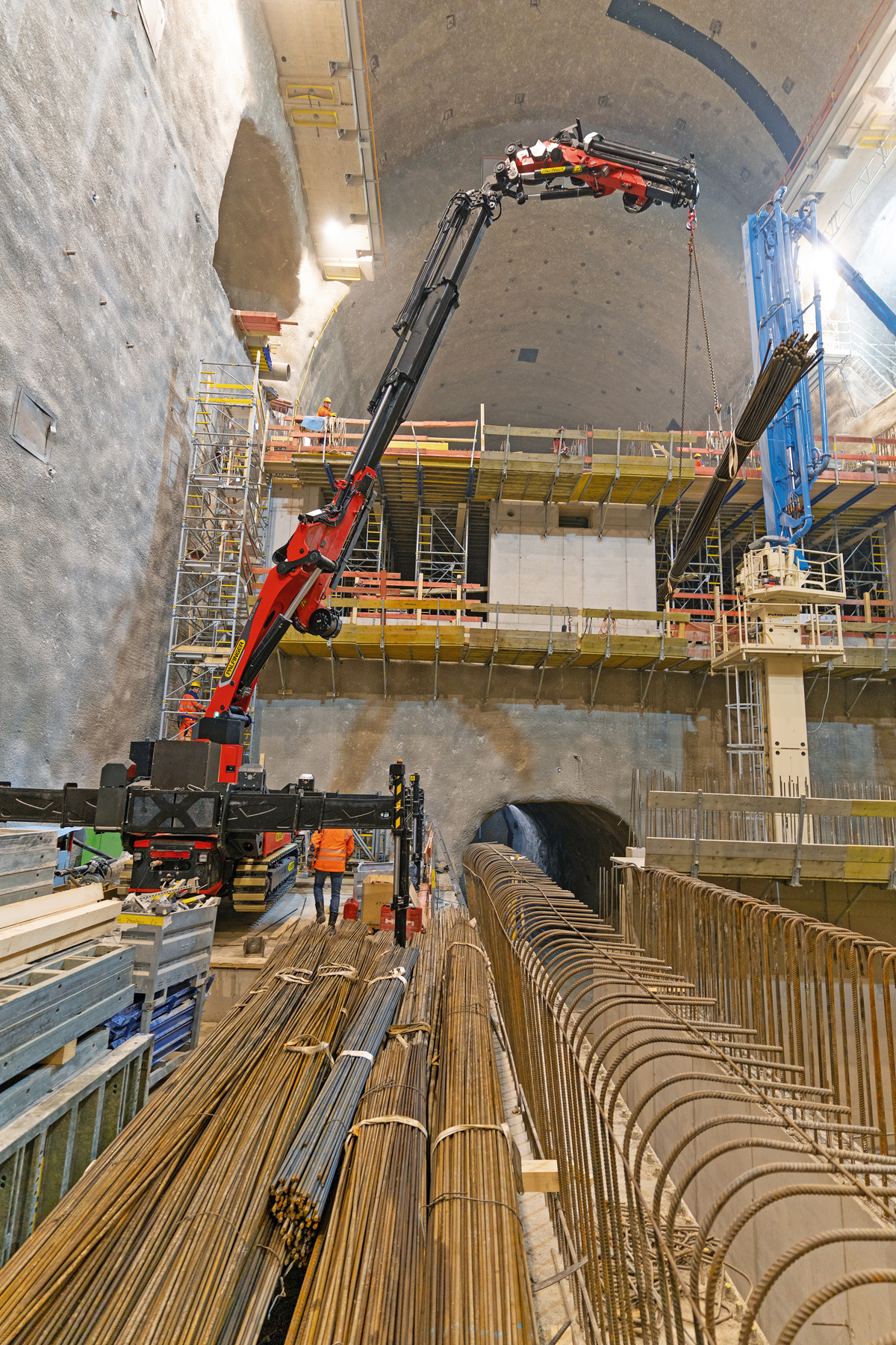 Die Herausforderung besteht bei diesem Einsatz unter anderem in einem straffen Zeitplan. Darüber hinaus müssen auf engstem Raum rund 15 000 m³ Konstruktionsbeton und 2 000 t Bewehrungsstahl und dafür Schalungsplatten und Maschinen innerhalb der Kaverne verhoben und montiert werden. Potenzielle Abstellflächen für Maschinen sind erwartungsgemäß klein und auch das Umstellen ist häufig mit viel Aufwand verbunden. Daher habe der kompakte PCC 57.002 von Palfinger mit einer Größe von 5,8 x 1,9 m die optimale Kranlösung für das Projekt dargestellt.