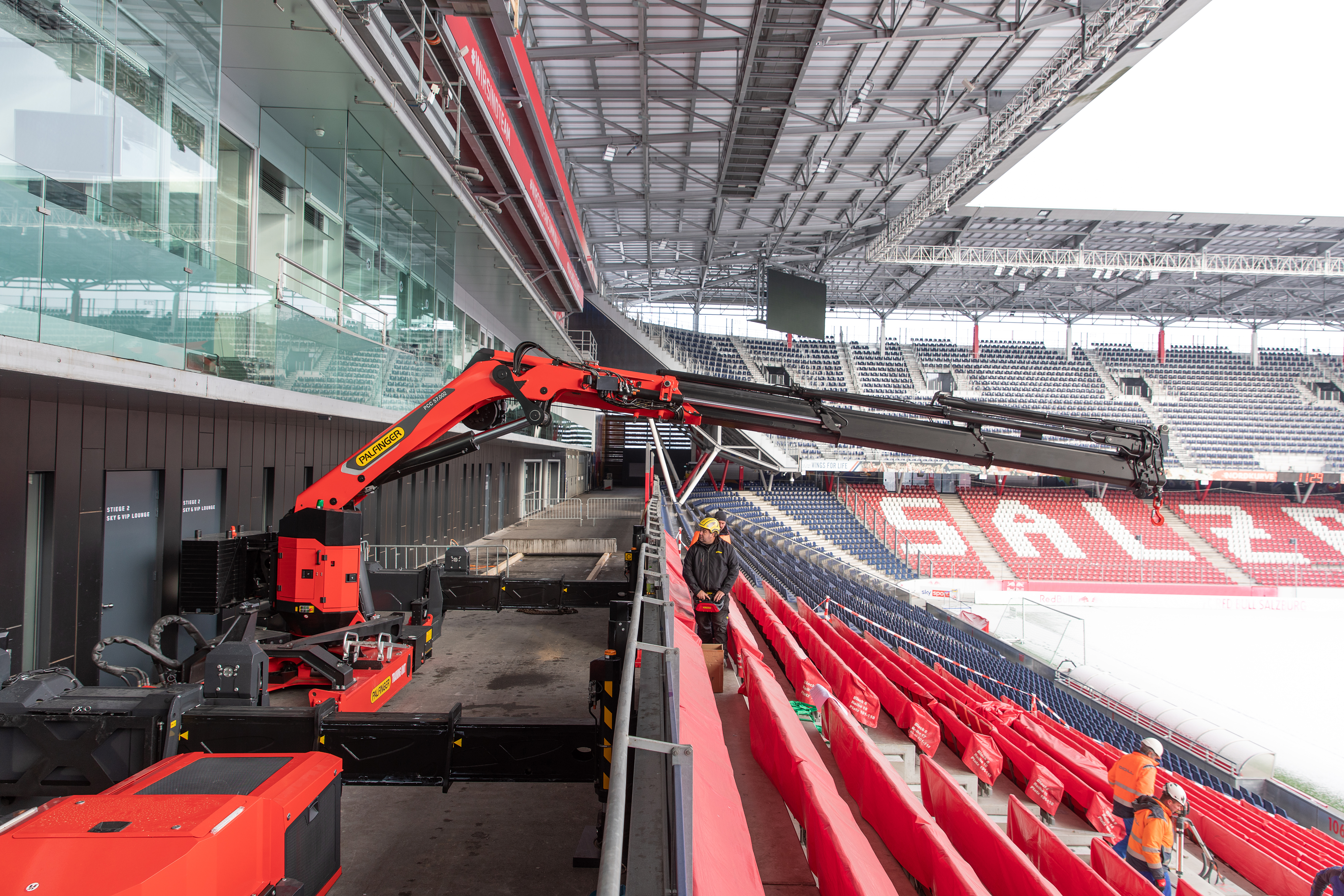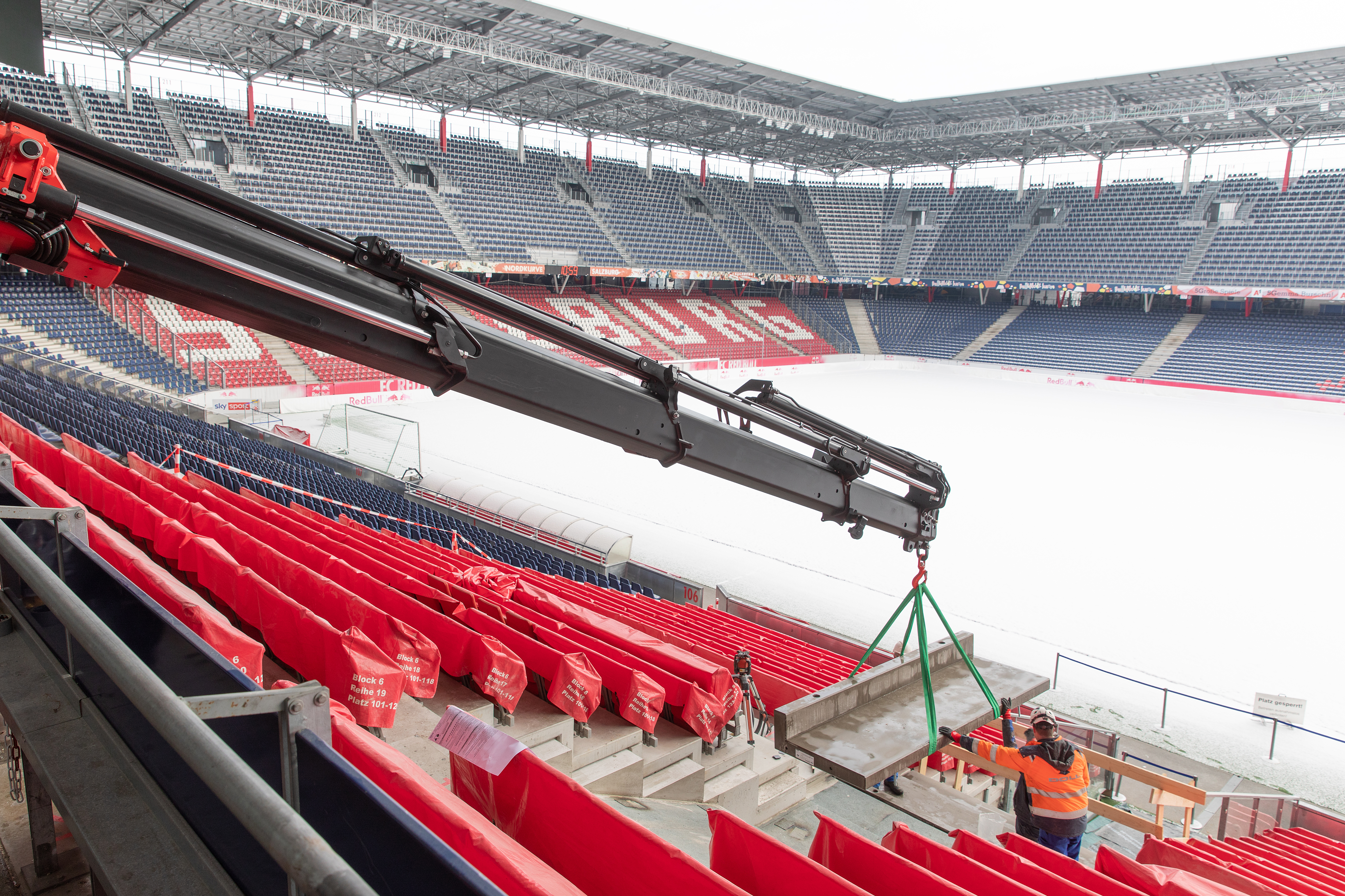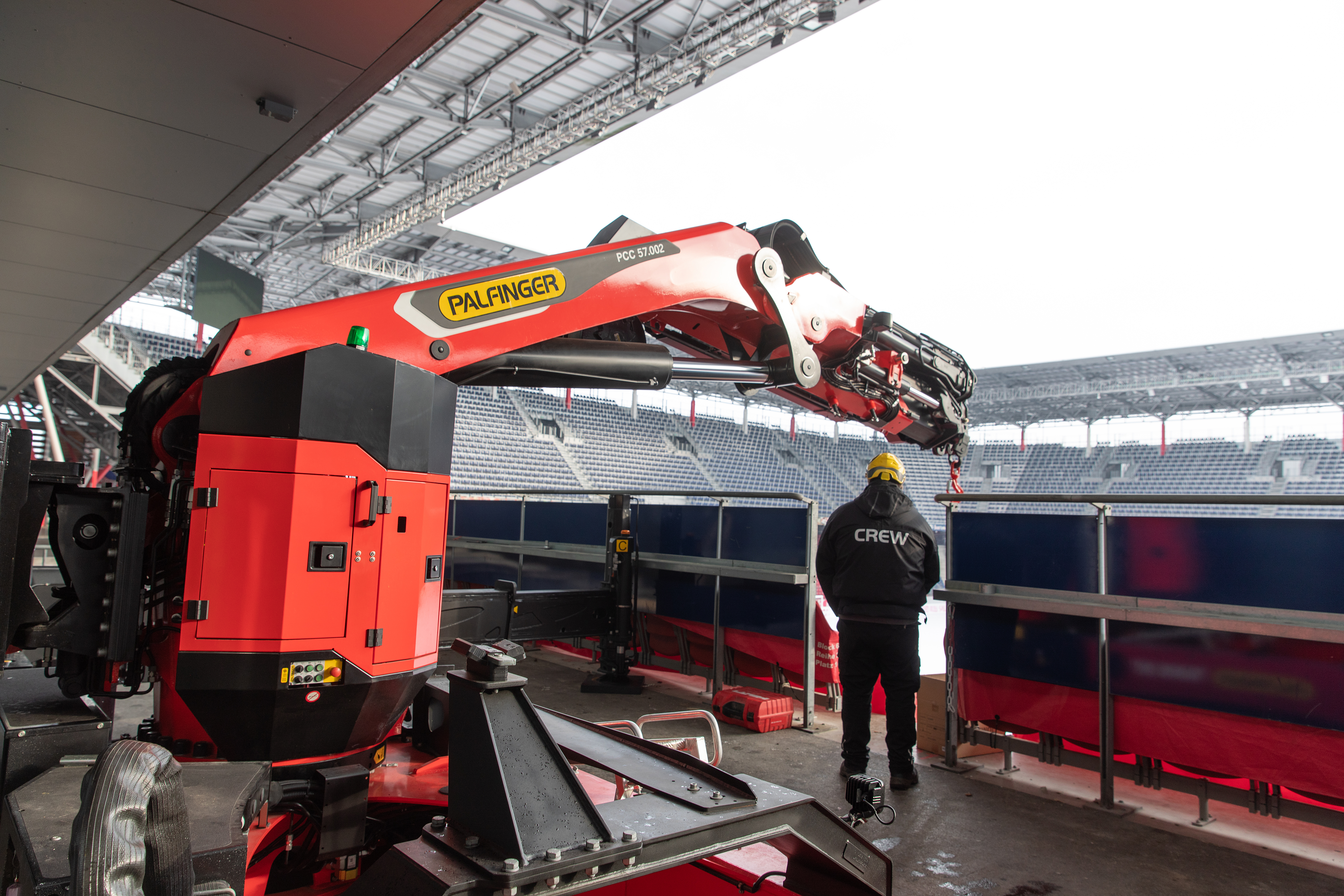 Fanjubel und ein spannendes Match zeichnen ein gutes Stadionerlebnis aus. Um in der kommenden Saison noch mehr Ballsportbegeisterte in der Red Bull Arena begrüßen zu können, wurde Ende Dezember 2022 die Tribüne des Stadions erweitert. Dazu mussten neun Betonelemente mit einem Gewicht von je 1,3 t über die Tribüne gehoben werden. Die Herausforderungen dabei: Der schmale Stadioneingang, mit lediglich 2,83 m Höhe und 2,87 m Breite, enge Wege, kaum Platz zum Wenden und exakte Anforderungen an die Statik des Untergrunds, die eine maximale Belastung von 16 t erlauben. »Uns war schnell klar, dass es sich hier um einen herausfordernden Einsatz handelt, den ein Standard-Vierachser-LKW mit Kran niemals hätte bewältigen können. Denn er hätte weder in das Stadion einfahren noch die Gewichtsbedingungen erfüllen können«, so Markus Egger, Polier bei Bauunternehmen Doll, das den Ausbau der Tribüne durchführte. »Die einzig logische und auch mögliche Lösung war der Palfinger PCC 57.002.«