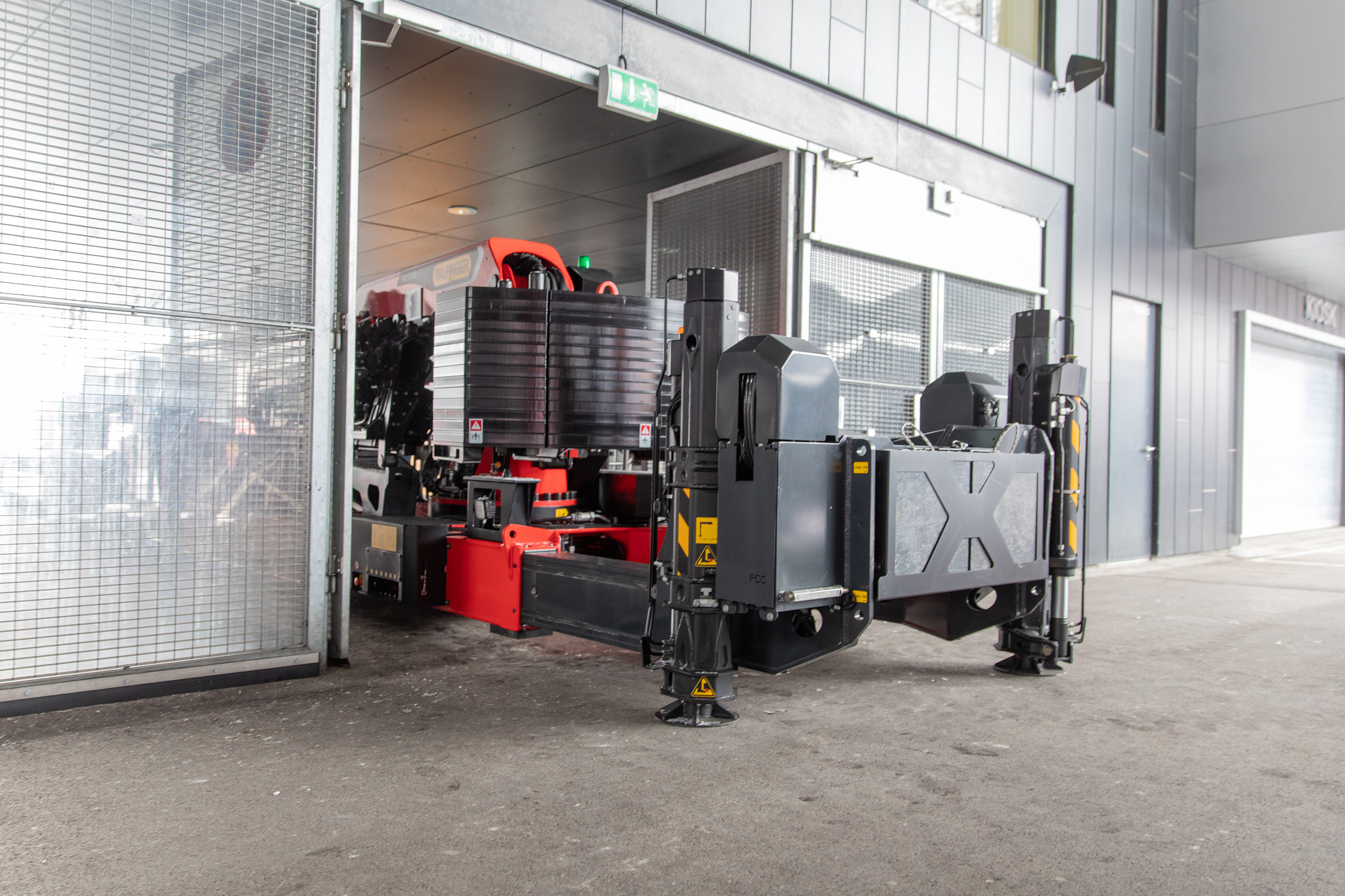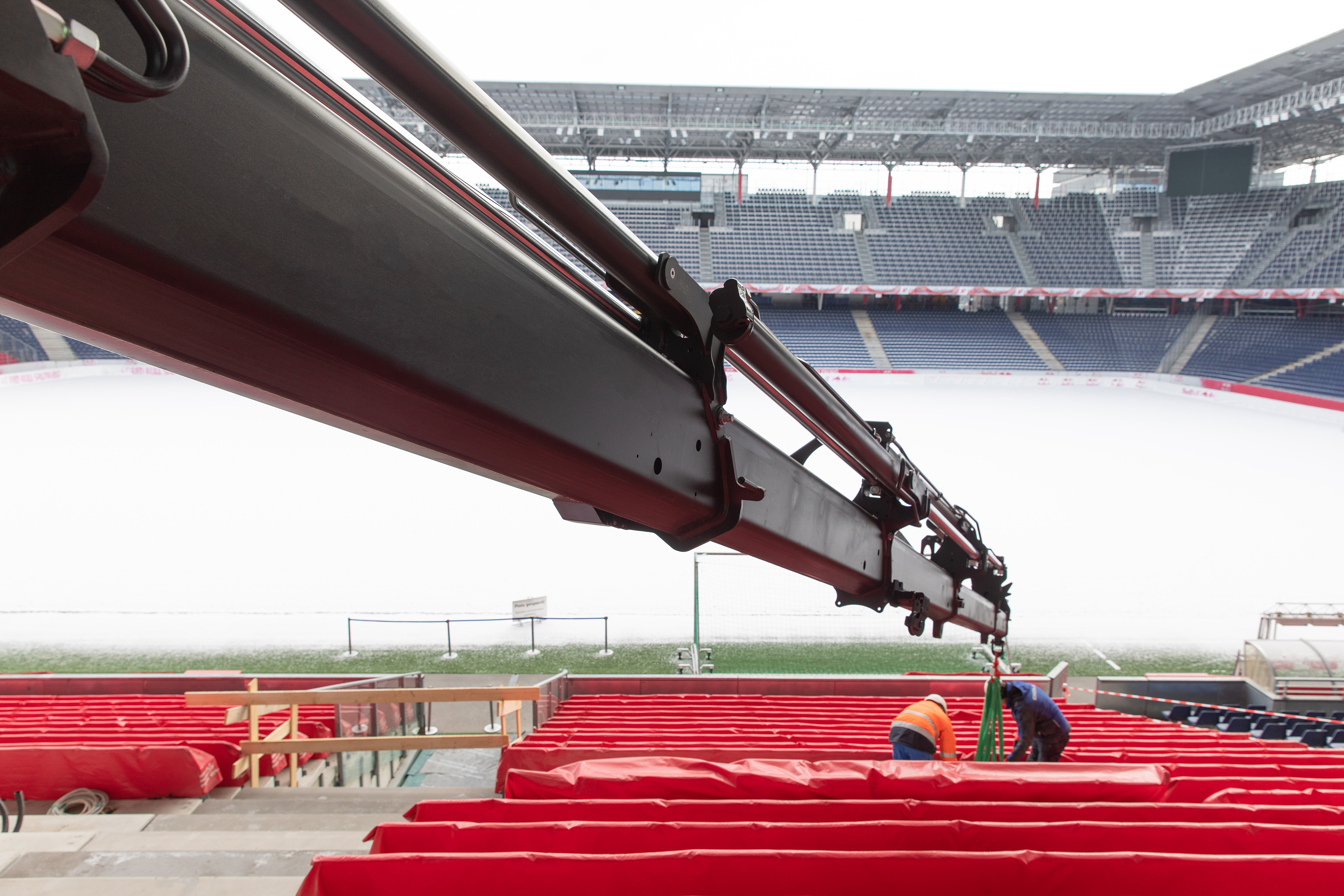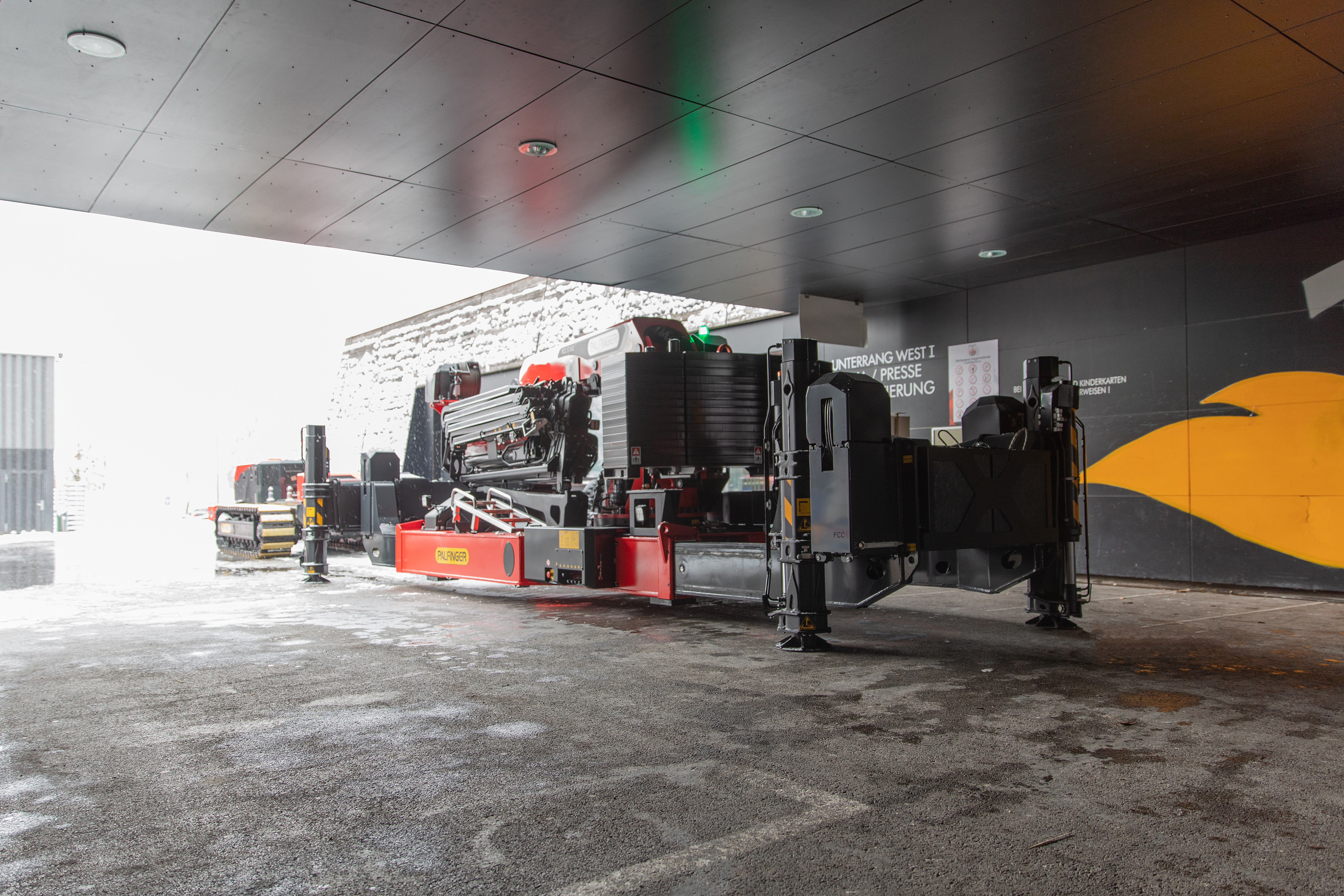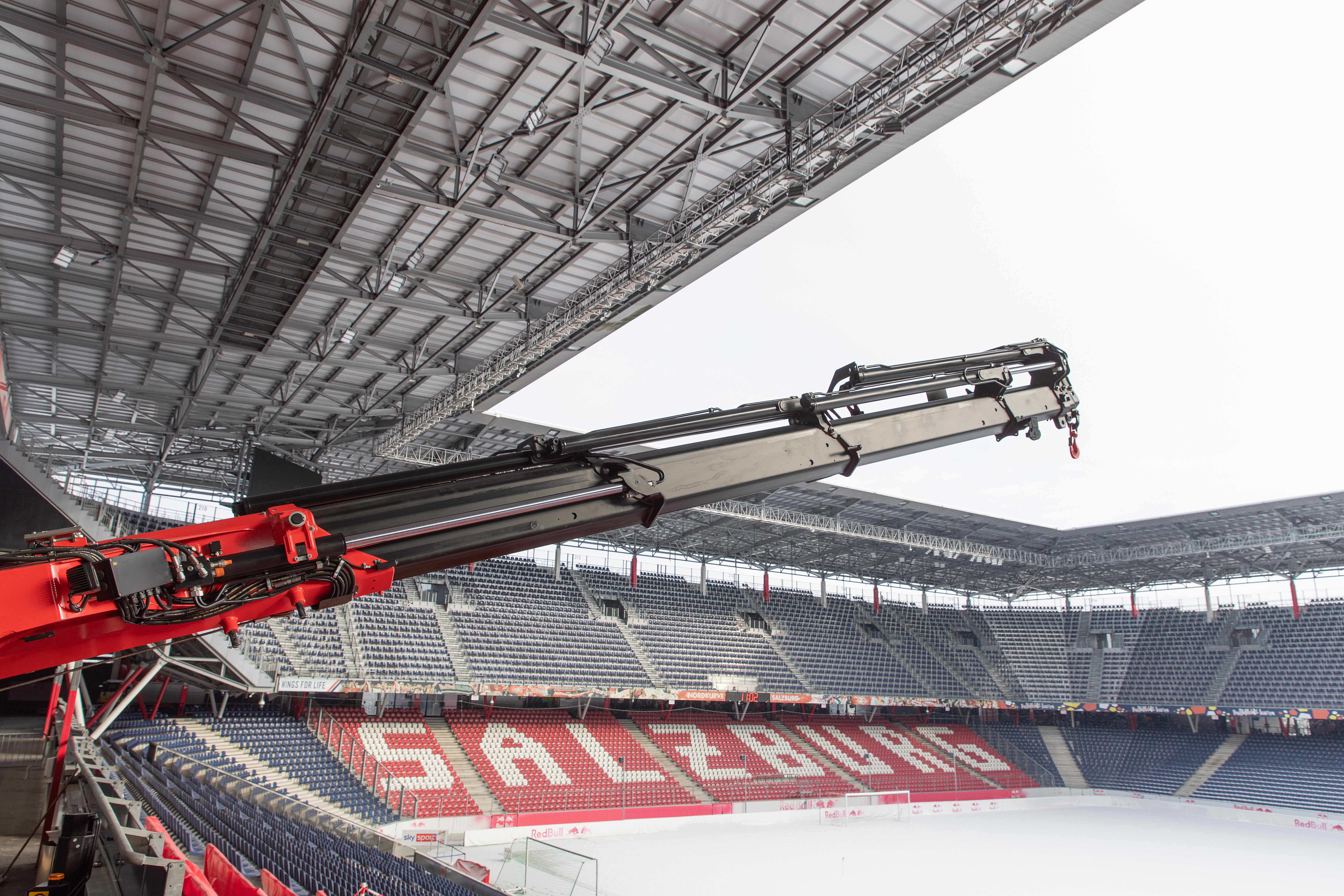 Fanjubel und ein spannendes Match zeichnen ein gutes Stadionerlebnis aus. Um in der kommenden Saison noch mehr Ballsportbegeisterte in der Red Bull Arena begrüßen zu können, wurde Ende Dezember 2022 die Tribüne des Stadions erweitert. Dazu mussten neun Betonelemente mit einem Gewicht von je 1,3 t über die Tribüne gehoben werden. Die Herausforderungen dabei: Der schmale Stadioneingang, mit lediglich 2,83 m Höhe und 2,87 m Breite, enge Wege, kaum Platz zum Wenden und exakte Anforderungen an die Statik des Untergrunds, die eine maximale Belastung von 16 t erlauben. »Uns war schnell klar, dass es sich hier um einen herausfordernden Einsatz handelt, den ein Standard-Vierachser-LKW mit Kran niemals hätte bewältigen können. Denn er hätte weder in das Stadion einfahren noch die Gewichtsbedingungen erfüllen können«, so Markus Egger, Polier bei Bauunternehmen Doll, das den Ausbau der Tribüne durchführte. »Die einzig logische und auch mögliche Lösung war der Palfinger PCC 57.002.«