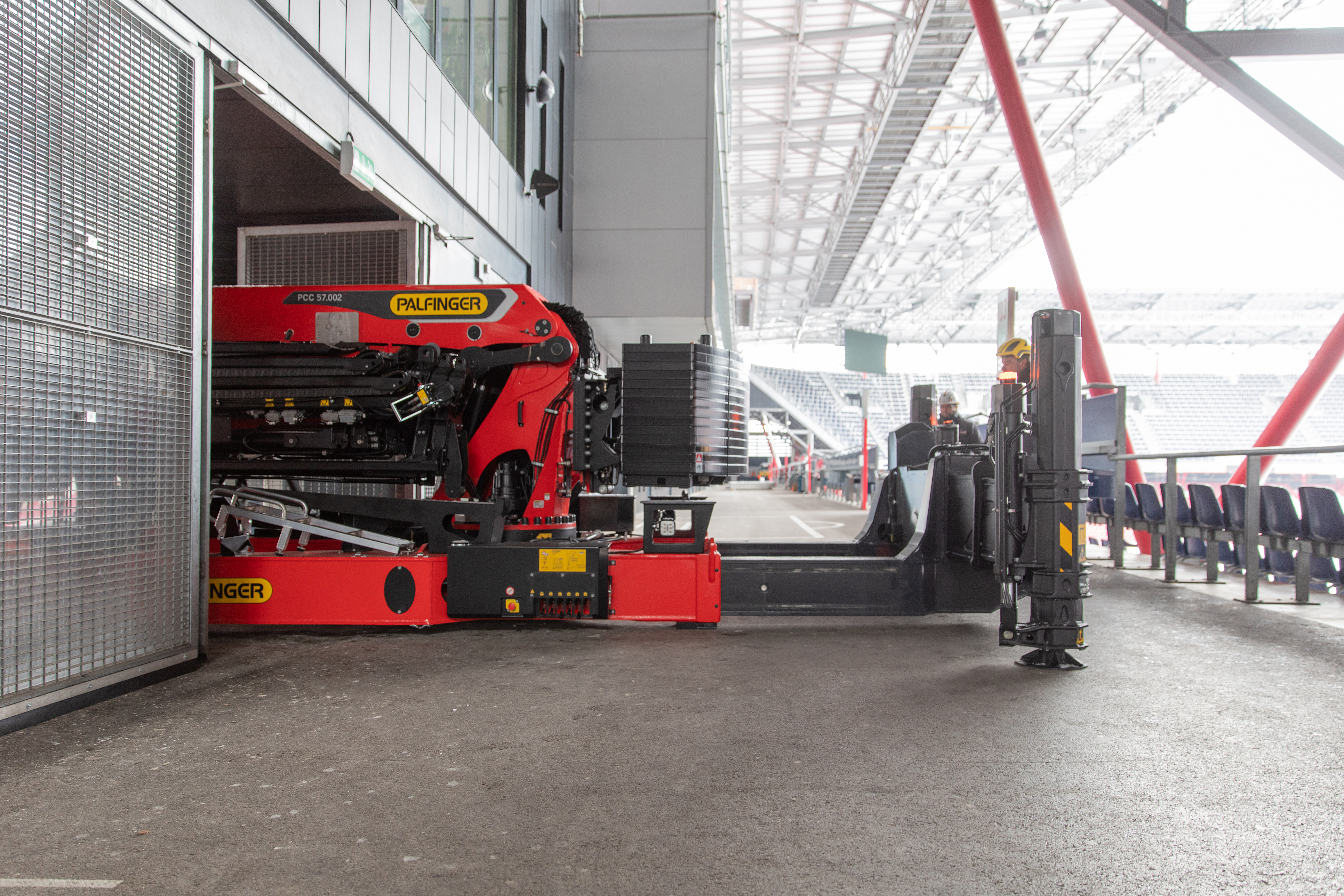 Raupenfahrwerk ermöglicht. So sei es leicht gewesen, den Zugang durch den niedrigen Stadioneingang zu bewältigen. Mittels eigener Stützausleger konnte er sich zudem schrittweise, aber auch optimal austariert und stabilisiert, durch die engen Gänge hin zu seinen Einsatzpositionen »shiften«. Dort wurde er wieder mit dem Fahrwerk verbunden. Denn um beim präzisen Einsetzen der Betonelemente das erste Stadion-Obergeschoss nicht zu beschädigen, musste nach allen Seiten hin millimetergenau gearbeitet werden. Für den kompakten Kran habe das kein Problem dargestellt. Für Egger war dies der erste, aber nicht der letzte Einsatz eines PCC 57.002: »Egal ob im Stadion oder bei anderen Spezialeinsätzen mit niedrigen Bauhöhen, wie in Garagen – der Palfinger Raupenkran überzeugt uns durch seine kompakte Größe, kombiniert mit sehr guter Manövrierbarkeit. Zudem kann auch mit angehobener Last gefahren werden. Er ist definitiv zu empfehlen.«