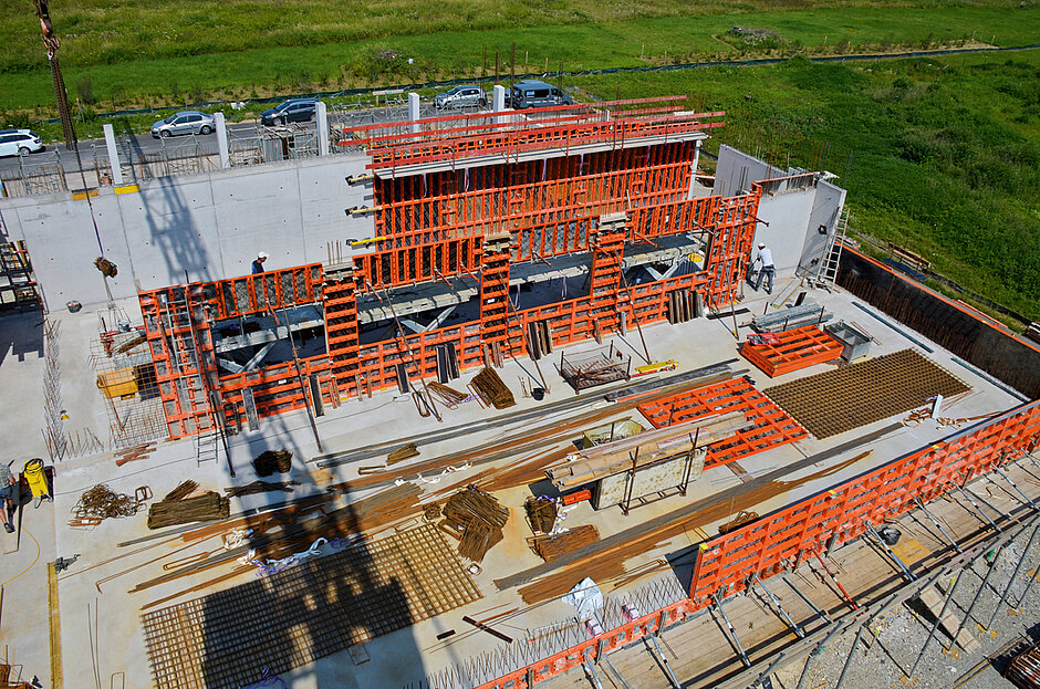 Zur Schalung der Stahlbetonwände und -stützen kamen rund 600 m² Logo.3-Wandschalung aus dem eigenen Schalungspark von Ritter-Bau zum Einsatz. Die Logo.3-Wandschalung hat sich laut Hersteller, dank der geringen Anzahl an Spannstellen und Fugen sowie dem besonders schmalen Rahmenabdruck, bereits bei vielen Einsätzen mit ausgezeichneten Sichtbetonergebnissen bewährt. Auch bei diesem Schalungseinsatz zeigte sich Ritter-Bau mit dem Schalungssystem sehr zufrieden.