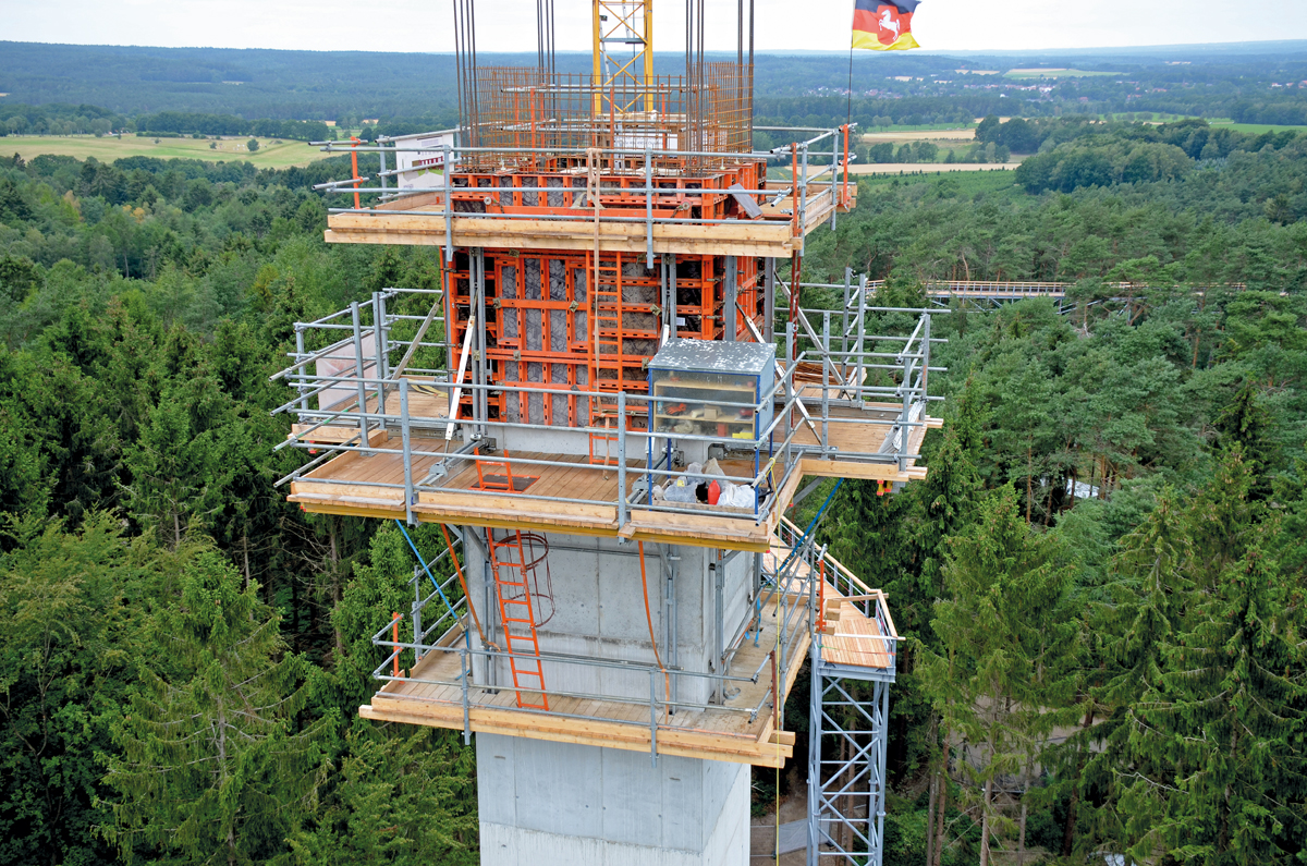 Im Wildpark Lüneburger Heide steht ein quadratischer Aufzugs- und Aussichtsturm. Von der Plattform auf 44 m Höhe ist nicht nur der Baumwipfelpfad Heide Himmel, sondern in der Ferne auch Hamburg zu sehen. Für die Schalung des Schachts wurde die Wandschalung »Logo.3« in Kombination mit dem »Klettersystem 240« zur Kletterschalung. Die Klettereinheit – bestehend aus der senkrechten Schaleinheit und drei Bühnen und Schutzgerüsten – wurde nur einmal vormontiert und jeweils mit einem Kranhub zum folgenden Betoniertakt angehoben. Bei zwei Takten pro Woche war der Aussichtsturm nach 14 Takten fertiggestellt. Dabei wurden rund 1 000 m³ Beton, 130 t Bewehrungsstahl, 600 t Stahl, 350 m³ Holz und 70 000 Schrauben verbaut.