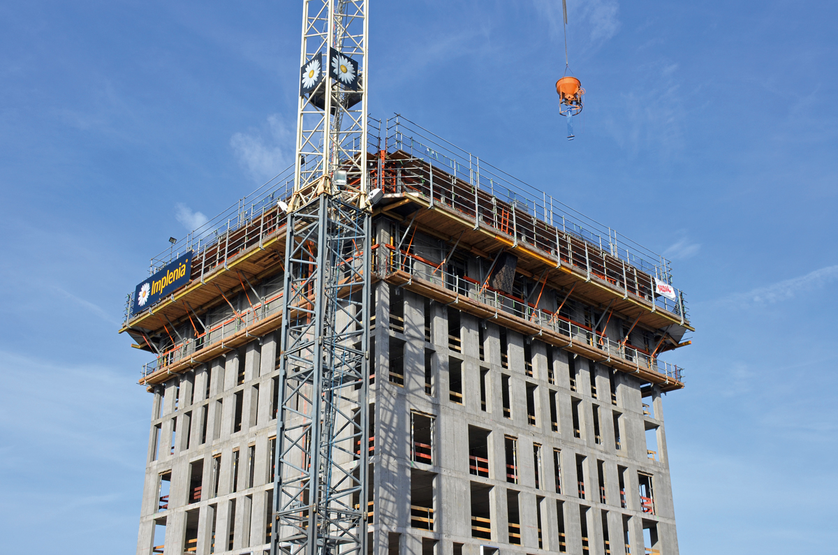 Ein besonderes Projekt stellte auch der Turm eines 4-Sterne-Hotels in Lörrach unweit der Schweizer Grenze dar. Für den Hotelneubau gegenüber dem Hauptbahnhof wurde ein besonderes Kletterkonzept erstellt, das das Klettersystem 240 mit dem Schalungssystem Logo.3 kombinierte. Bis auf eine Höhe von 63 m und über 20 Etagen wurde damit die Schalung realisiert. Allerdings war es der Wunsch der ausführenden Bauunternehmung Implenia Bau, dass die Kletterbühnen mit möglichst wenigen Kranhüben von Geschoss zu Geschoss nach oben wanderten. So wurden zwei Kletterbühnengrößen miteinander kombiniert und die Kranhübe optimiert. Durch diese Maßnahme reichten je Turmseite vier Kletterbühnen mit circa sechs Meter Länge. Ein spezieller Riegel wurde konstruiert, um die Horizontalkräfte aus den Kletterbühnen sicher in die verbleibenden Stahlbetonwand und Pfeiler abzutragen.