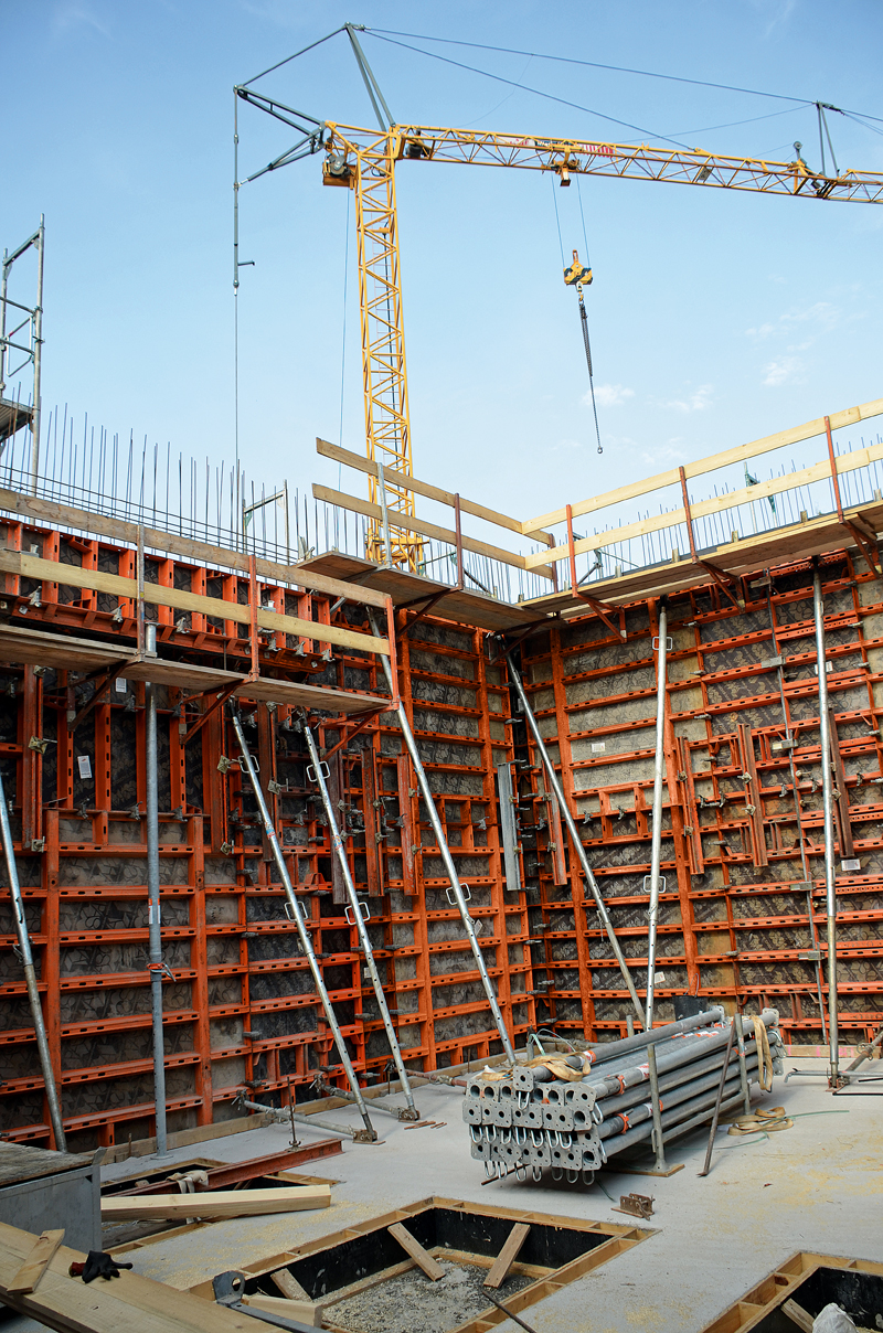 Zum Abtragen der Lasten während der Betoniervorgänge nutzte U & W das Alu-Traggerüstsystem Gass. Die Deckenscheiben haben einen Querschnitt von 25 cm, die Unterstützungshöhe im Untergeschoss beträgt 7,3 m und im Erdgeschoss 5,5 m. Das Alu-Traggerüst von Paschal eignet sich universell als Traggerüst auch für Deckentische, zur Ausführung von Lasttürmen und als Einzelstütze. Dabei ist bis zur Höhe von 6,5 m nur eine Stütze notwendig. Die acht variablen Anschlussmöglichkeiten an den Stützen zeigen die Vielseitigkeit und reduzieren die Rüstzeiten in Verbindung mit der schnellen Keilverbindung. t