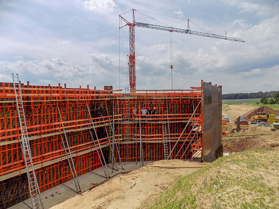 Im Rahmen der Vorbereitungsgespräche für die optimale Schalungsplanung zeigte sich, dass das Paschal-Schalsystem Logo.3 am besten geeignet sein würde, um die vier Brückenwiderlager für die Bauwerke 4 und 9 im System zu schalen. Zudem verfügt die Bauunternehmung Wilhelm Becker über eigene Schalungssysteme, die Universalschalung Raster/GE und die Stahlrahmenschalung Athlet, aus dem Hause Paschal mit denen die tragenden Gründungsplatten mit Dicken von bis zu 1,6 m schon eingeschalt und betoniert wurden.