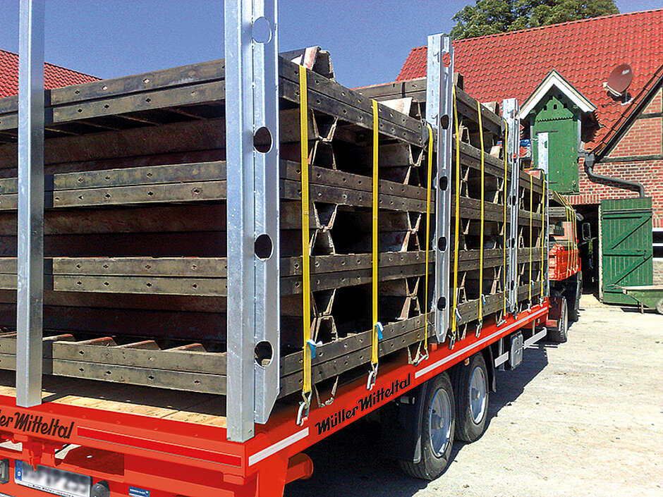 Ein Ladungssicherungssystem für Schalungstafeln bietet das Fahrzeugbauunternehmen Müller Mitteltal aus dem Schwarzwald für die Baubranche an. Das System besteht aus sechs Paar Steckrungen, für die im Außenrahmen Rungentaschen eingelassen sind.