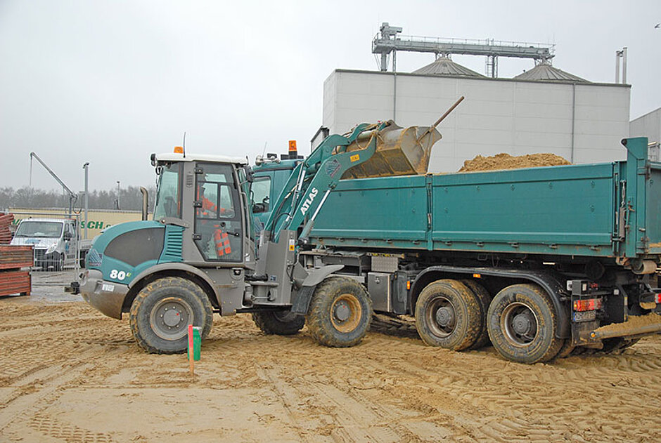 Die Fahrer der Baumaschinen sind mit der Entscheidung ihres Chefs für die Weycor-Radlader 80e voll einverstanden. Die Leistungsdaten sprechen für sich: Die Z-Kinematik bietet eine hohe Reißkraft von 6 800 daN und kurze Auskippzeit. Die Schubkraft beträgt 5 250 daN und die Hubkraft in Bodenlage 6 035 daN. »Das sind Werte, die für unsere Arbeiten wichtig sind. Geräte die keine Leistung bringen, können wir nicht gebrauchen.« Das Dienstgewicht des 80e beträgt 6 220 kg, das Volumen der Standardschaufel 1 bis 1,2 m³. Atlas Weyhausen bietet ein umfangreiches Sortiment an Schaufeln und Zubehör an, sodass jeder Radlader für den individuellen Einsatz und ebensolche Ansprüche ausgerüstet werden kann.
