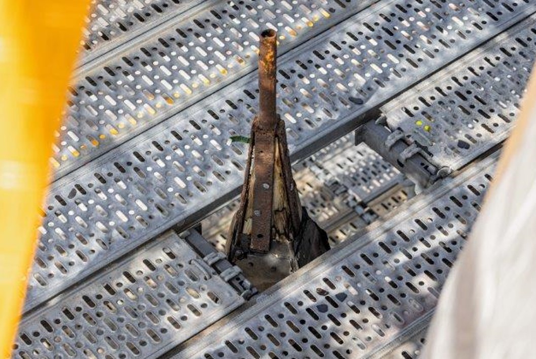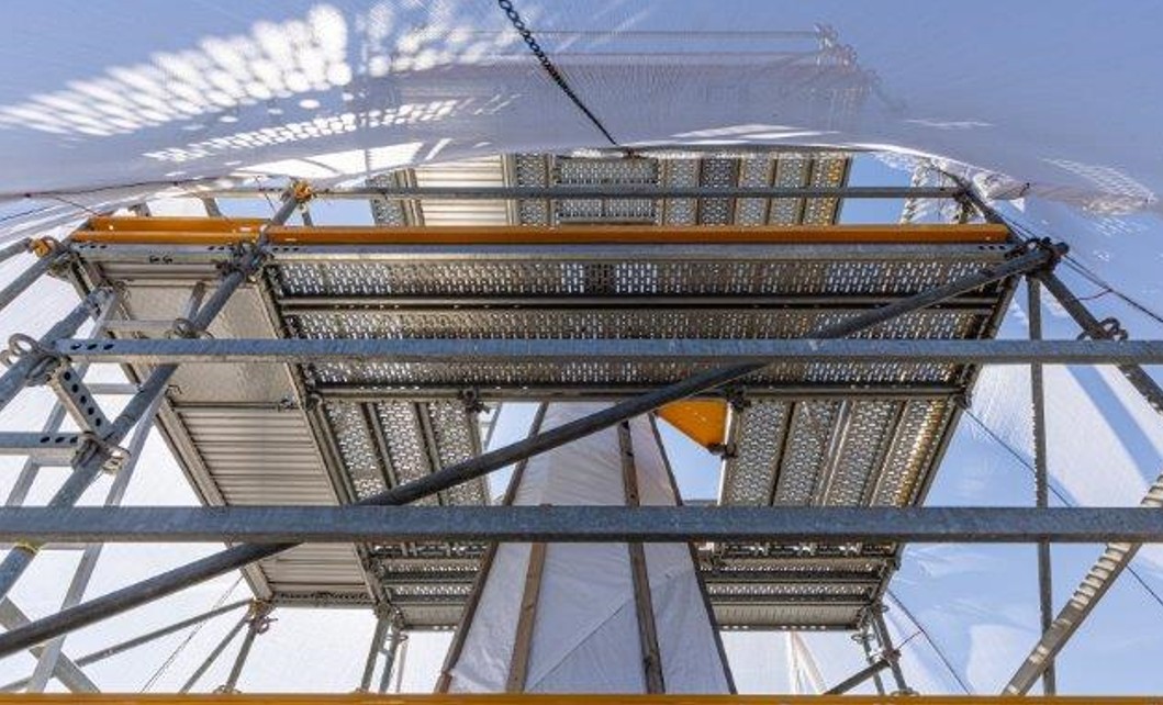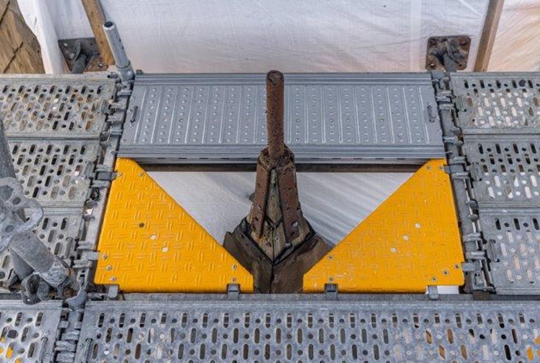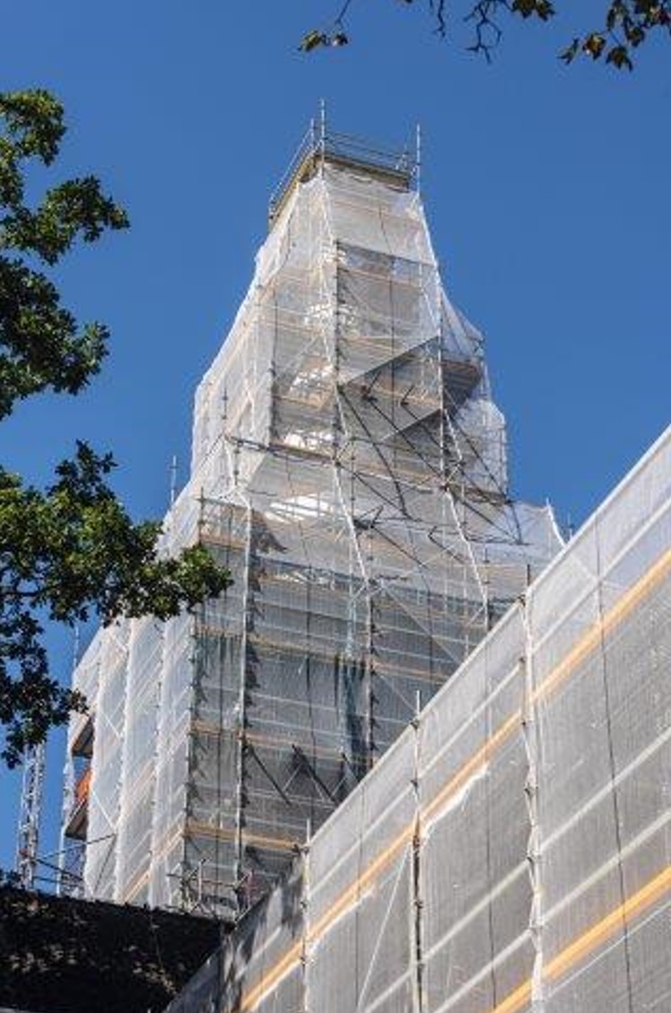 In Verbindung mit Eckblechen konnte somit auch weitestgehend auf Überwurfbohlen verzichtet werden, zugunsten von ebenen Belagflächen ohne gefährliche Stolperfallen. Ein weiterer Vorteil des metrischen Gerüstrasters: Die stufenweise Verschlankung bis zur Kirchturmspitze ließ sich ohne zusätzliche Gitterträger ausführen.