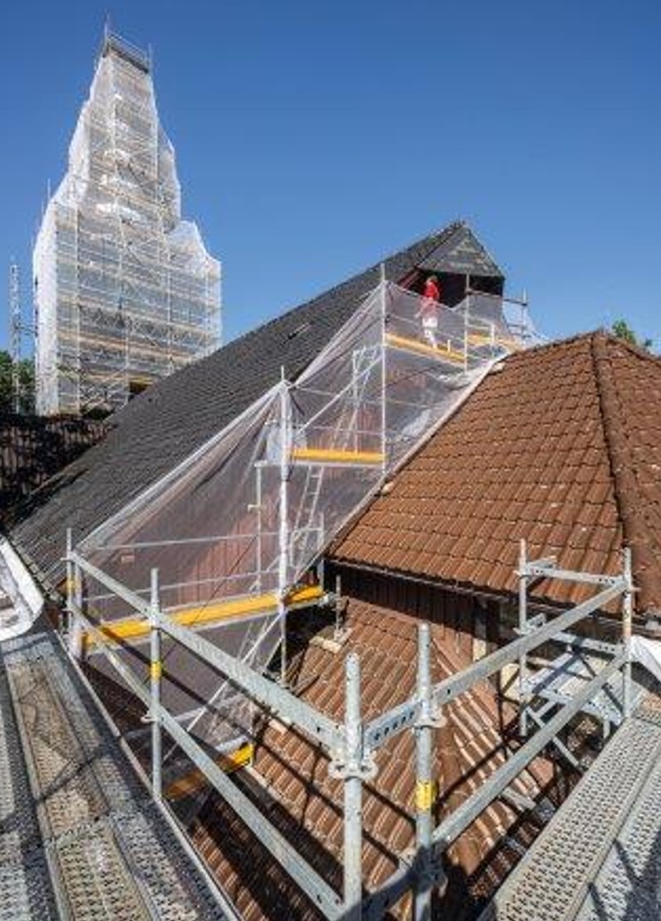 Kirchenschiff und -turm umschließt ein Arbeits- und Schutzgerüst, das der regional ansässige Gerüstbaubetrieb Fiß mithilfe des Peri Up Gerüstbaukastens im Juni 2023 errichtet hat. Die Anpassung der Einrüstung an die filigrane Kirchengeometrie sowie die stufenweise Verschlankung bis zur 42 m hohen Turmspitze sorgen hierbei für eine sichere Arbeitsumgebung. Zudem erlauben die stolperfrei ausgeführten Arbeitsebenen die unproblematische und fachgerechte Durchführung aller Sanierungsarbeiten.