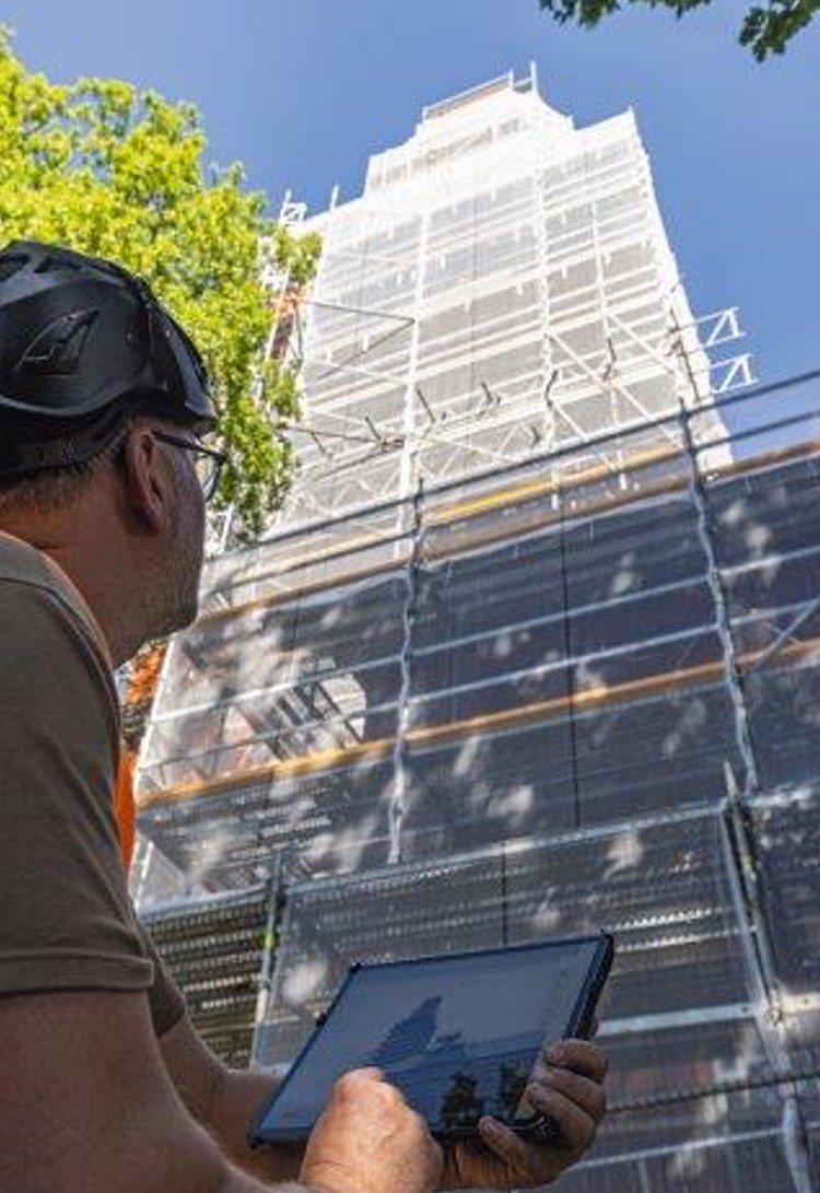 Die Fiß-Gerüstspezialisten verwendeten für die Gerüstmontage die Peri Extended Experience App (XR). Diese stellte das in Peri CAD geplante 3D-Gerüstmodell auf Tablet oder Smartphone digital bereit. Die Vorteile gegenüber Planzeichnungen auf Papier: Den Gerüstbaumonteuren steht grundsätzlich die aktuelle Zeichnungsversion zur Verfügung und es lässt sich jede Detaillösung aus beliebigen Perspektiven darstellen. Fiß-Gerüstbaumeister Holger Ebert nutzt die XR-Visualisierung gerne auch für die Gespräche mit den Bau- und Planungsverantwortlichen, um bereits frühzeitig Problempunkte ansprechen und entsprechende Lösungsmöglichkeiten anbieten zu können.