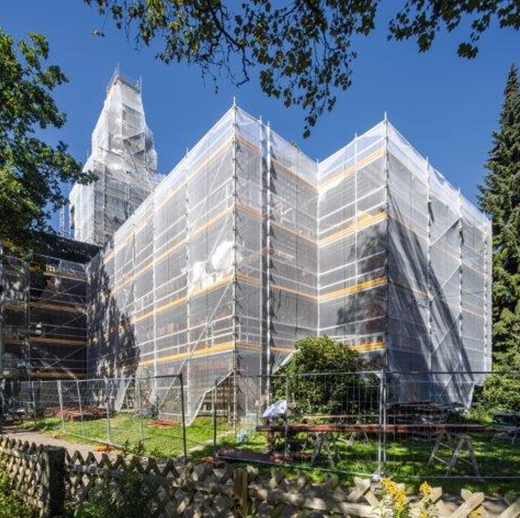 Der Wintersport- und Luftkurort Braunlage liegt im Zentrum des Nationalparks Harz. Wohnhäuser und Kirchen in Holzbauweise prägen auch hier das Ortsbild. Mittendrin die 1889 im neugotischen Stil erbaute Trinitatiskirche, die in diesem Jahr grundlegend saniert wird. Die Kirchenfassade wird rundum neu gestrichen, schadhaftes Holz ausgewechselt. Am Kirchturm wird das Turmdach neu mit Schieferplatten gedeckt, zudem werden diverse Reparaturarbeiten an der Turmspitze und an der Kirchturmuhr ausgeführt.