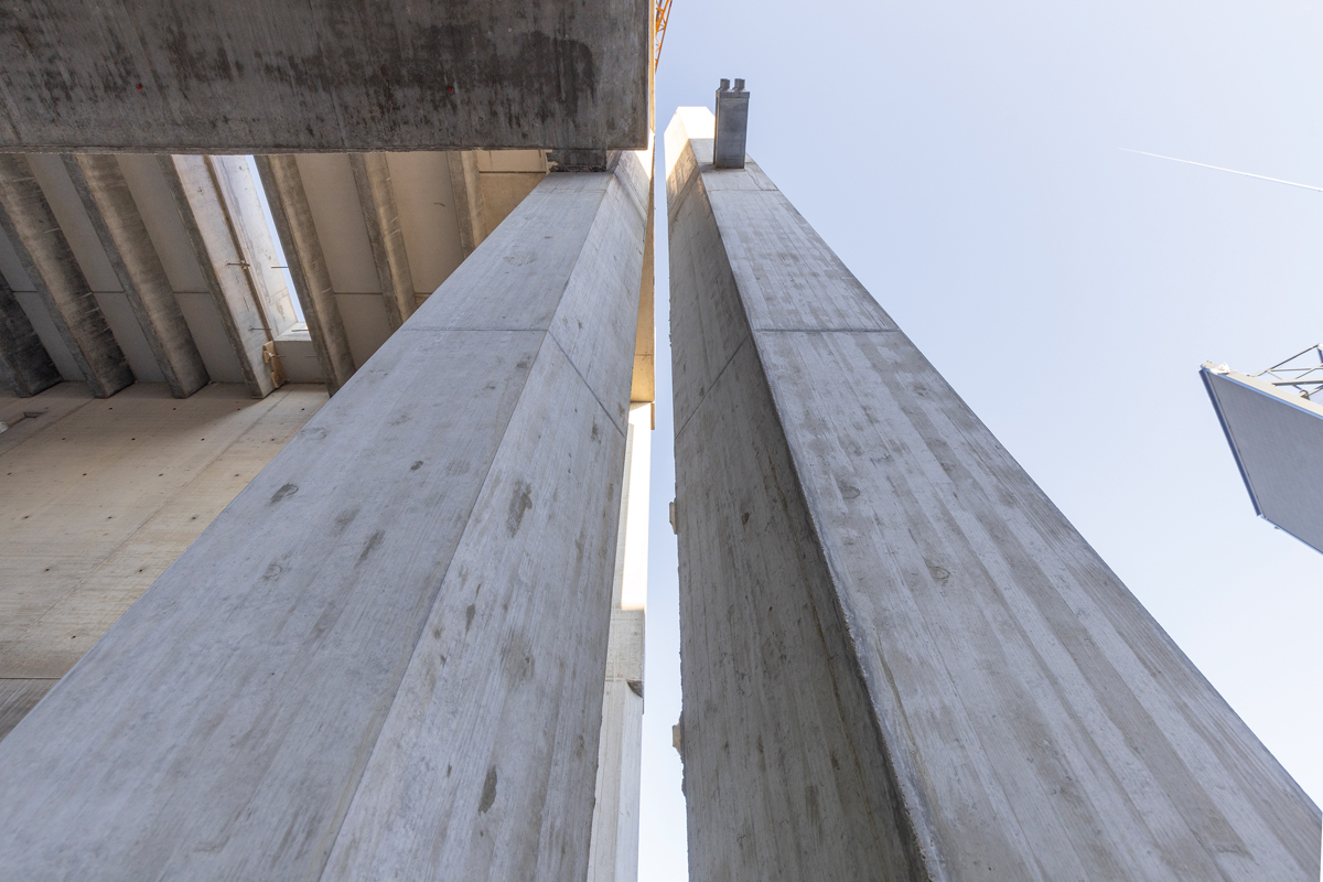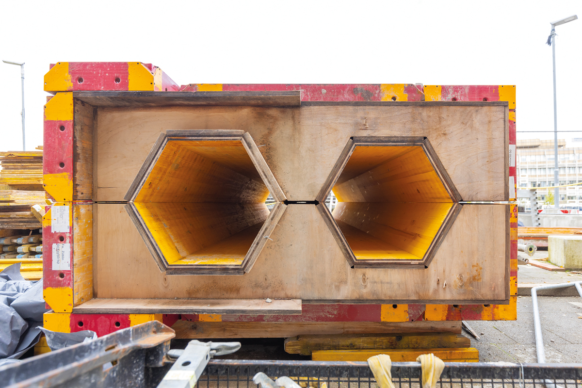 Für die als Doppel- oder Einzelstützen herzustellenden Sechseckstützen mit zwei unterschiedlichen Querschnittsabmessungen lieferte der Peri-Sonderschalungsbau projektspezifisch gefertigte Stützenschalungen einsatzfertig auf die Baustelle. Die Schalungseinheiten für die Doppelstützen berücksichtigten Peri zufolge den mit nur 20 cm äußerst geringen Abstand zwischen zwei Stahlbetonstützen. Maßgenau zugeschnittene Knaggenkästen wurden dabei werksseitig mit einer Systemschalung kombiniert: teils mit der Vario GT 24 Säulenschalung, teils mit der Maximo-Struktur-Rahmenschalung. Wie auch bei allen Sichtbetonwänden sorgten 3S-Schalungsplatten für die geforderte SB4-Betonoberfläche.