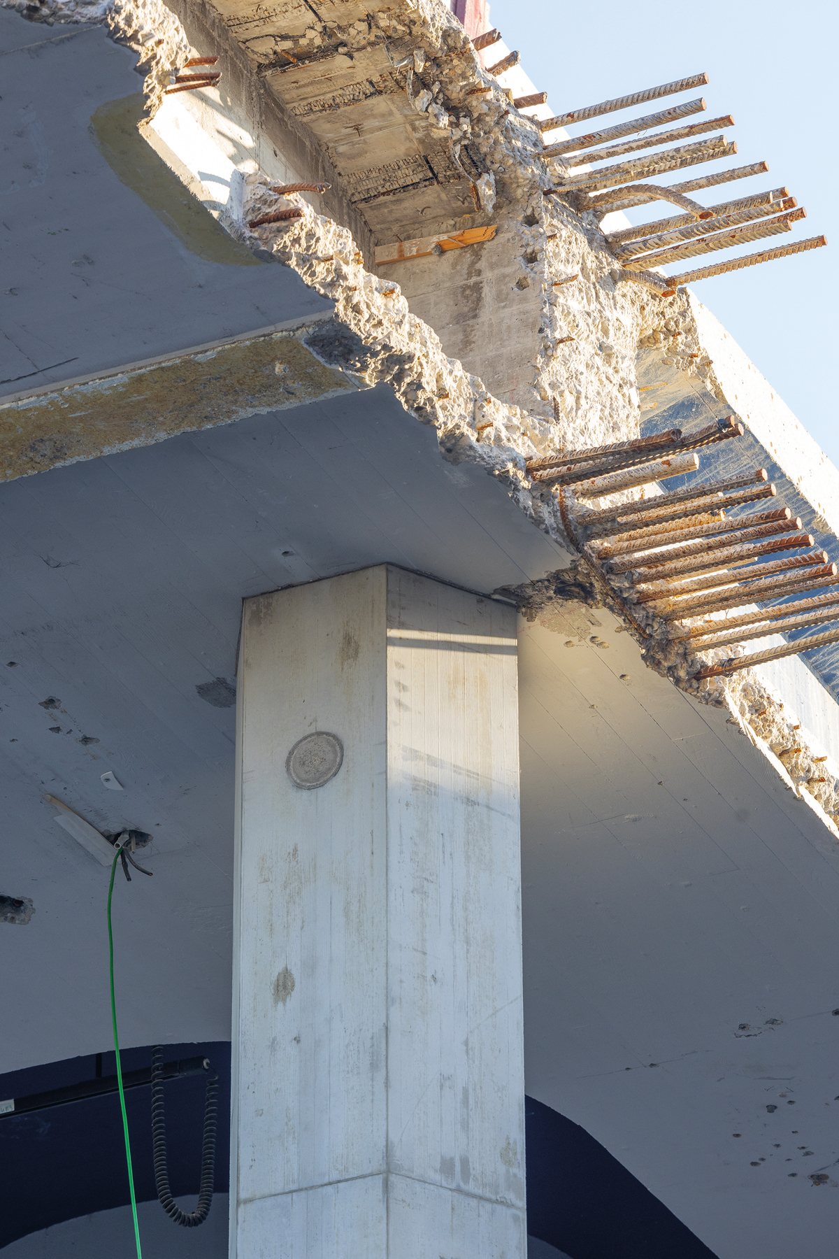 Hierbei zeigte sich Peri UP nach Aussagen des Herstellers mit seinem metrischen 25-cm-Systemraster äußerst flexibel: ob als räumlich ausgebildetes Traggerüst, als 10- bis 16-stielige Kraftpakete oder als vierstielige Schwerlaststützen. Beispielsweise konnten beim „16-Stieler“ die Vertikalstiele mit 25-, 50-, 75- und 150-cm-Horizontalriegeln eng gebündelt, dennoch aber über System-Diagonalen ausgesteift und so an die jeweilige geometrische und statische Anforderung angepasst werden. Oder das Traggerüst wurde mit rucksackartigen Auskragungen erweitert, sodass an den freien Deckenrändern eine sichere Arbeitsebene zur Verfügung stand.
