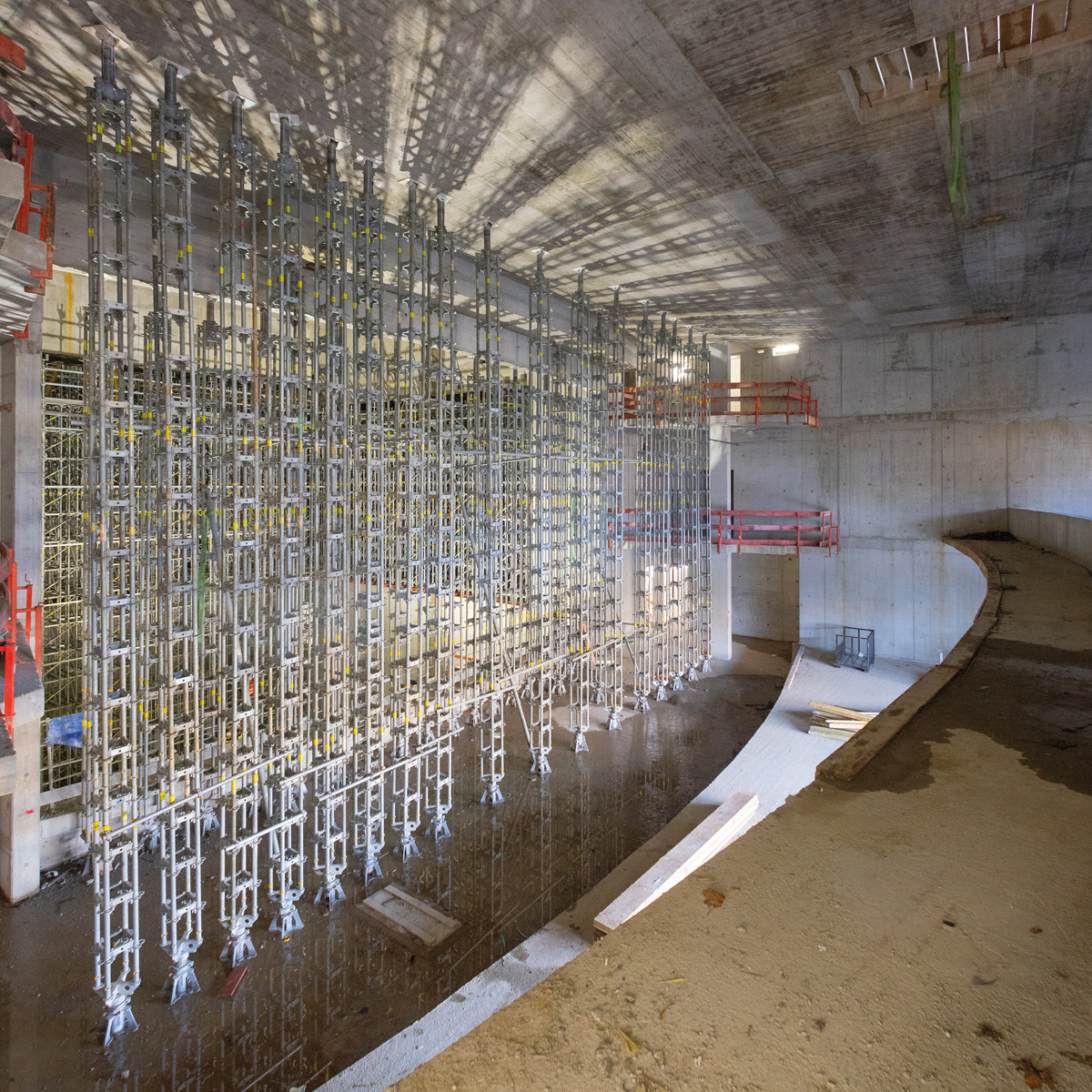 Hinzu kommt, dass rund um den 32 m hohen Bühnenturm ein projektspezifisches Traggerüstkonzept zur temporären Lastableitung erforderlich war, da erst mit der Fertigstellung der Turmdach-Attika die volle Eigentragfähigkeit des Bauwerks erreicht werden konnte, teilt Peri mit. Die Frischbetonlasten der jeweils zu betonierenden Geschossdecken mussten mittels Notunterstützung über insgesamt drei darunterliegende Etagen verteilt abgetragen werden. Nicht zuletzt bot das innerstädtische Baufeld nahezu keine Lager- und Montageflächen, die Materialdisposition erforderte somit enge Liefertaktungen.