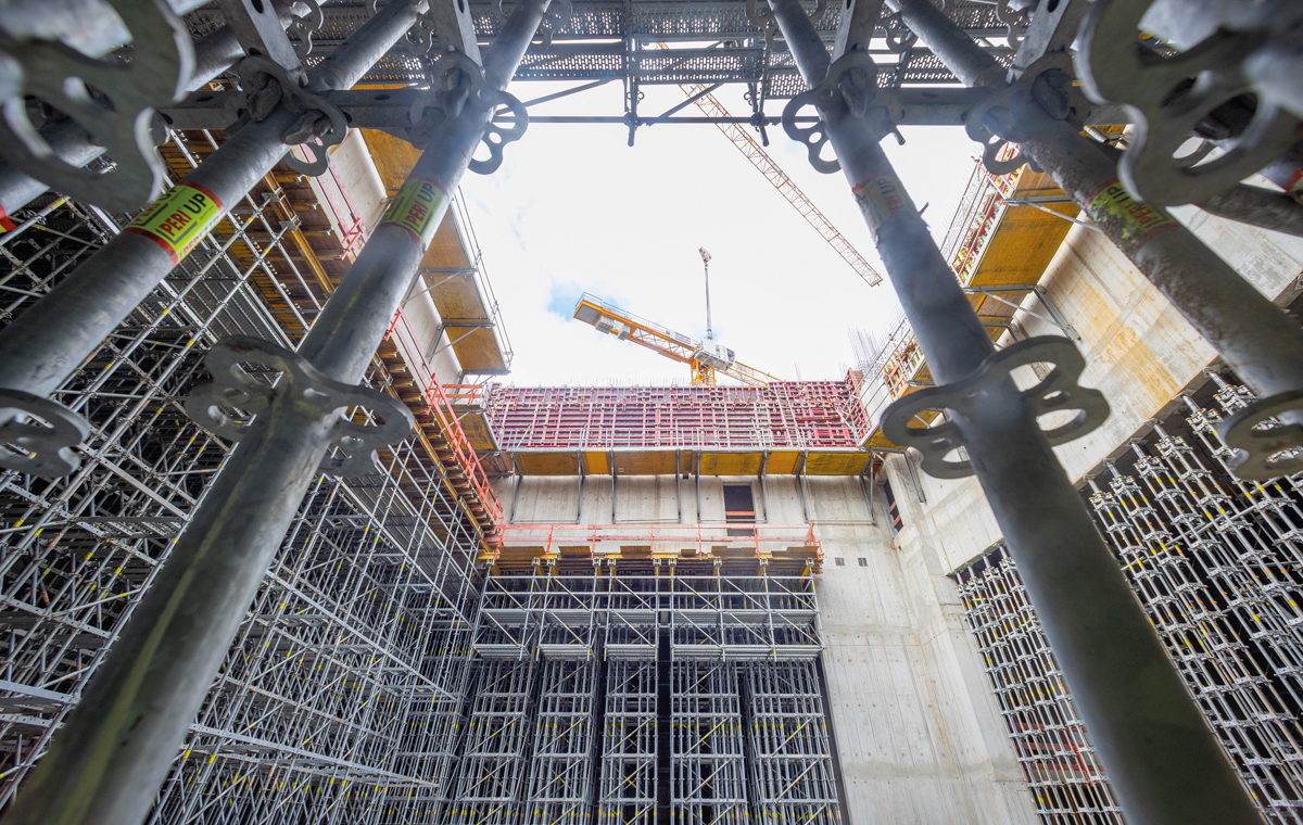 Das Peri-Konzept für die aufwendige Lastabtragung im Bauzustand basierte nach Angaben des Unternehmens weitestgehend auf dem Gerüstbaukasten Peri UP. Dieser konnte mittels unterschiedlicher Aufbauvarianten an die entsprechenden Lasten und Unterstützungshöhen angepasst werden. Und diese hatten es in sich: Unterhalb der wandartigen Träger betrugen die Linienlasten bis zu 250 kN/m, unterhalb des 3. OG mussten die Lasten teils über 17,25 m bis in die Bodenplatte des 2. UG abgeleitet werden.