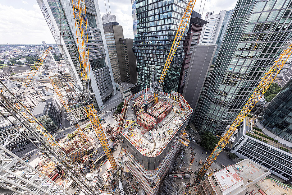 Alle vier Türme fußen auf einem mehrstöckigen, zusammenhängenden Kellerkasten, auf dem ein Podium platziert ist, das den Kern des neuen Viertels bildet. Die Passagen mit Einzelhandel und gastronomischen Angeboten schaffen direkte Verbindungen in die Frankfurter Innenstadt und die umliegenden Viertel. Für die Errichtung des Kellerkastens und des Podiums sowie der anschließenden Türme, erstellte das global agierende Peri Team wirtschaftliche Lösungen, die für einen reibungslosen Projektablauf sorgten.