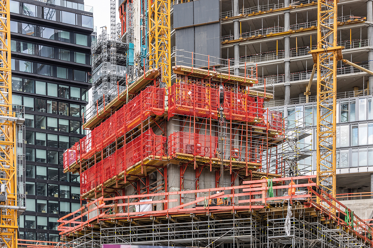 Für die Geschossdecken kamen die Skydeck Paneel-Deckenschalung, die Multiflex Träger-Deckenschalung sowie beim T2 und T3 zusätzlich projektspezifische Deckentische zum Einsatz. So konnte jeder Grundriss effizient geschalt und durch die Skydeck Frühausschaloption kurze Taktzeiten erreicht werden. Mit Peri Kletterschutzwänden wurden die Absturzkanten der oberen Geschosse lückenlos umschlossen. Das Personal war dadurch zu jeder Zeit gegen Absturz und vor herabfallenden Gegenständen gesichert und gleichzeitig vor starkem Wind geschützt.