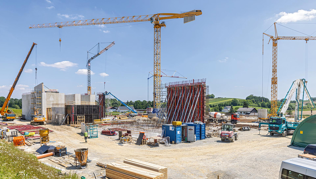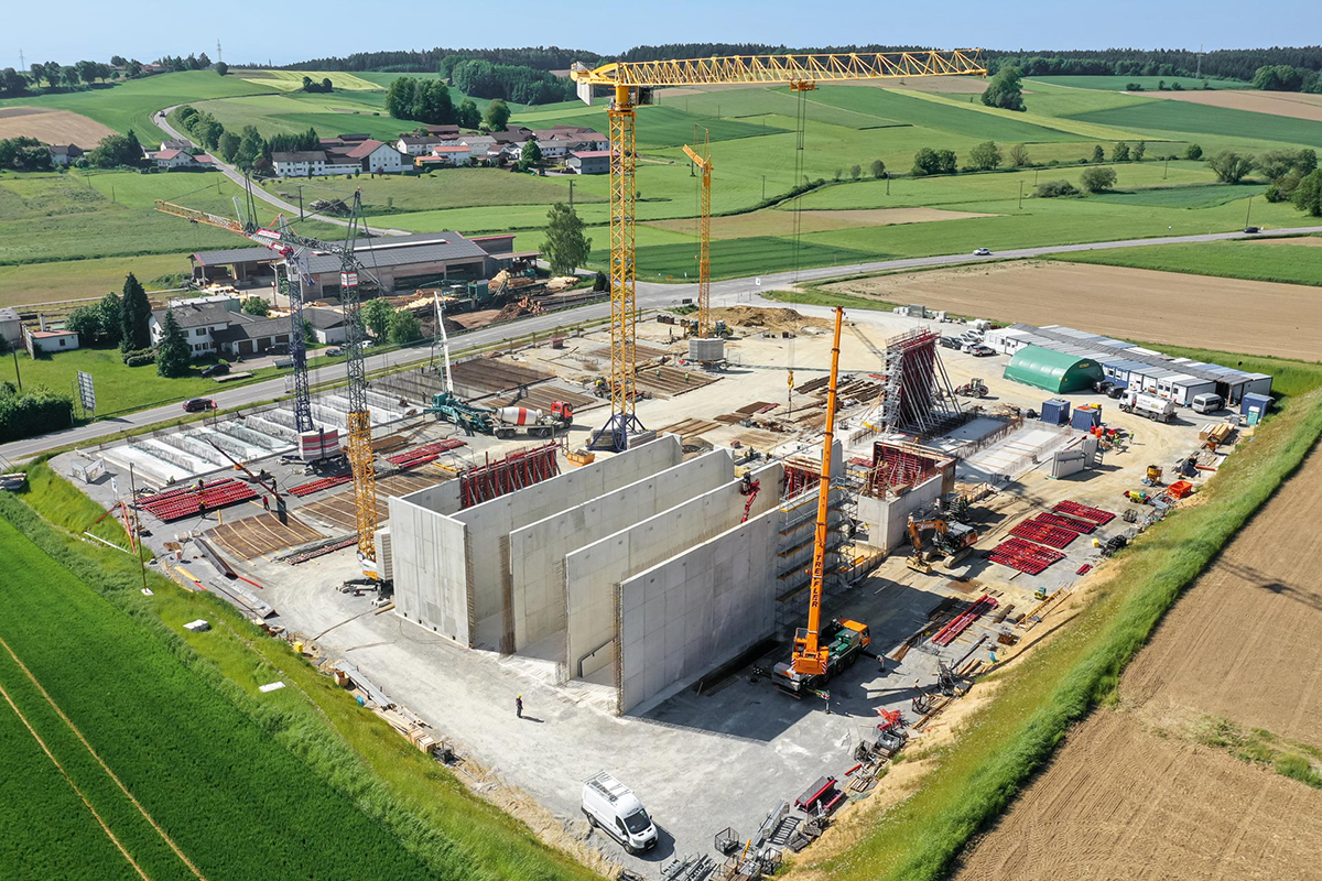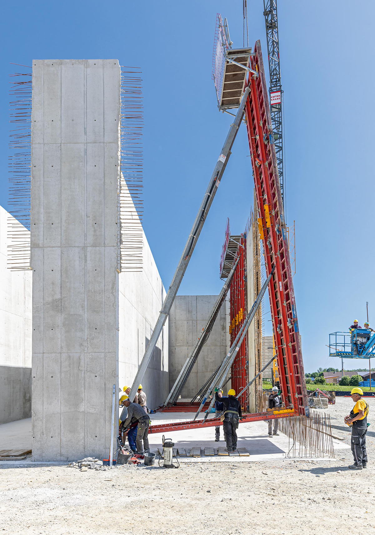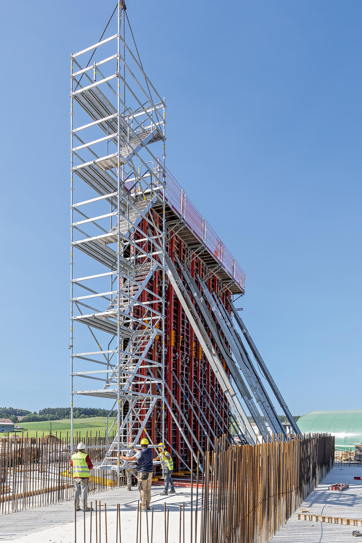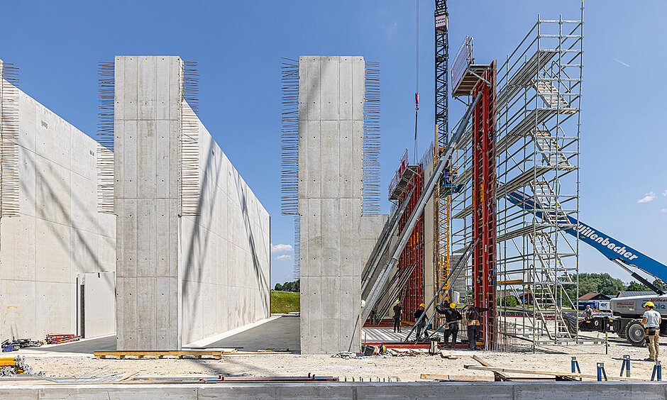 Um den geplanten Fertigstellungstermin und die damit verbundene kurze Bauzeitvorgabe einhalten zu können, verarbeitet das Rodinger Bauunternehmen Feldbauer jeden Tag 60-80 m³ Beton. Dementsprechend sind auch alle Schalungs- und Bewehrungsaufgaben darauf abgestimmt. Nürnberger PERI Ingenieure unterstützen die anspruchsvolle Baumaßnahme mit einer Schalungs- und Gerüstlösung, die es erlaubt, im regelmäßigen Tagestakt voranzukommen. Insbesondere bei den über 10 m hohen Stahlbetonwänden der 8 Siloboxen sorgen komplett kranversetzbare Umsetzeinheiten dafür, dass täglich ein Takt mit 12 m Wandlänge geschalt, bewehrt und betoniert werden kann. Für die insgesamt 40 Takte sind 3 Stell- und 2 Schließschalungen im Einsatz.