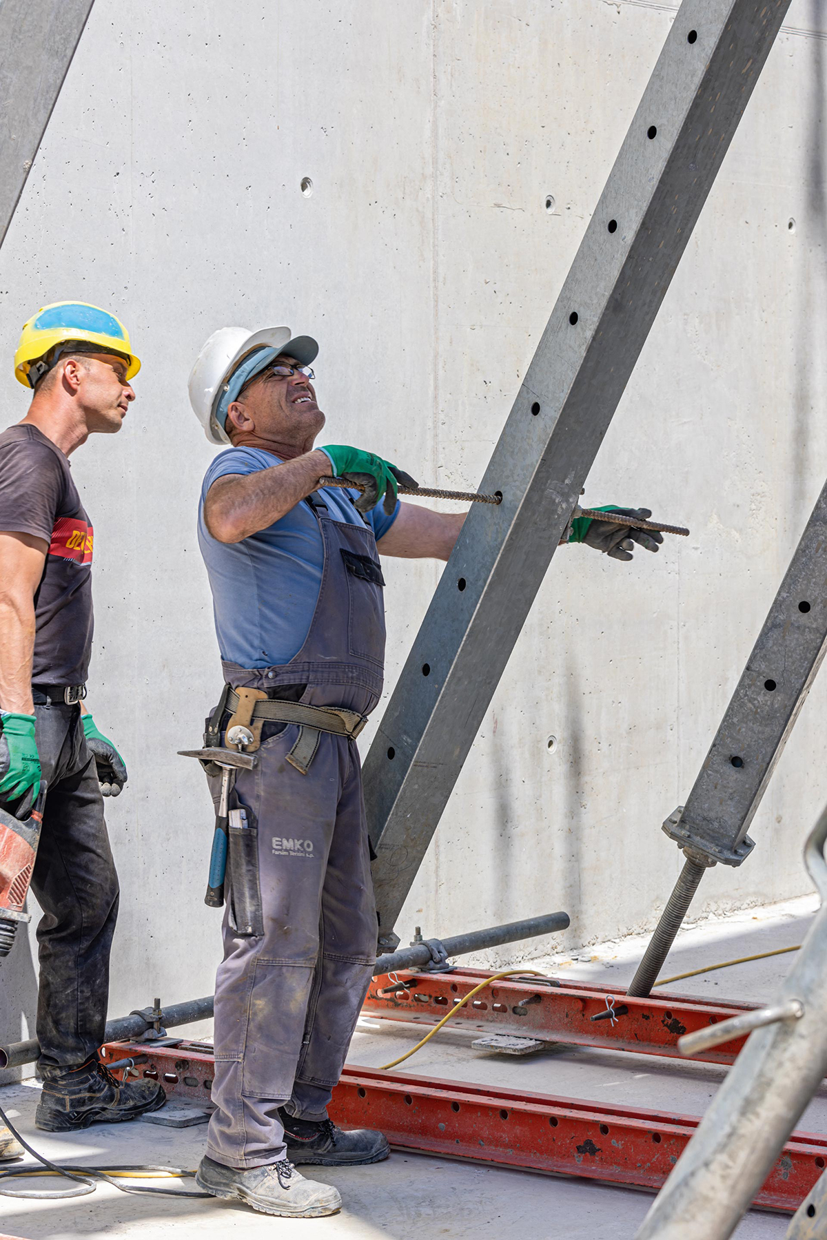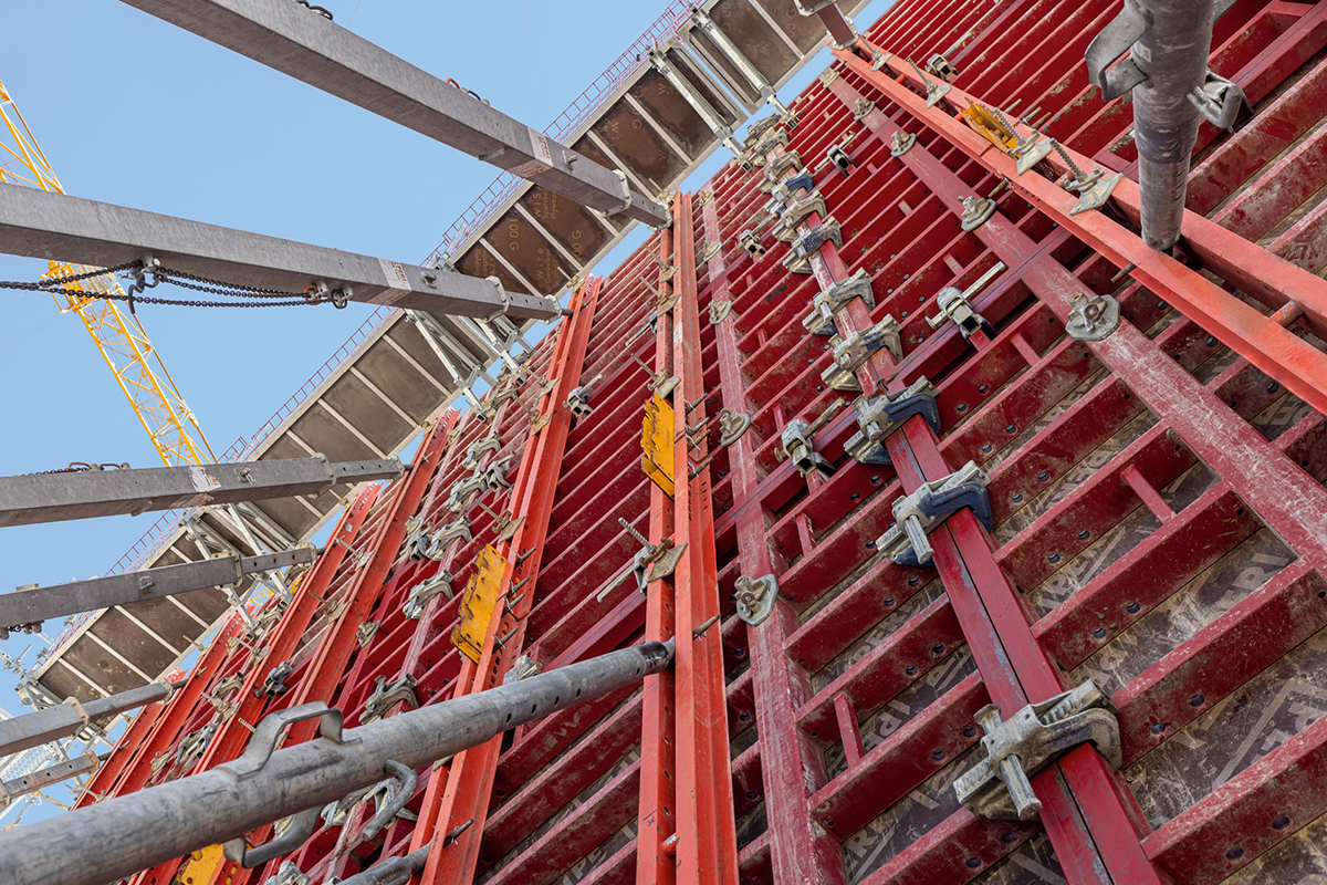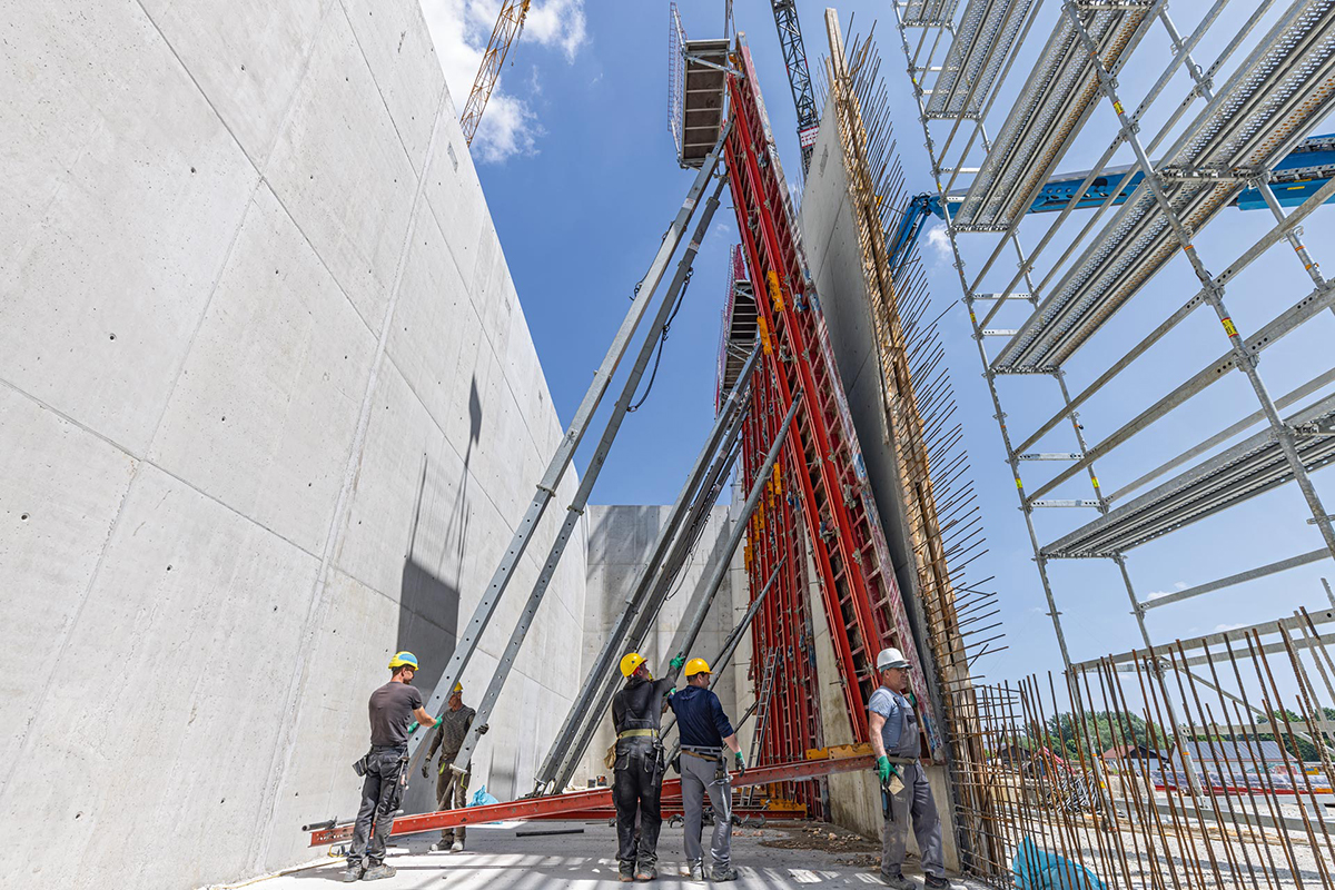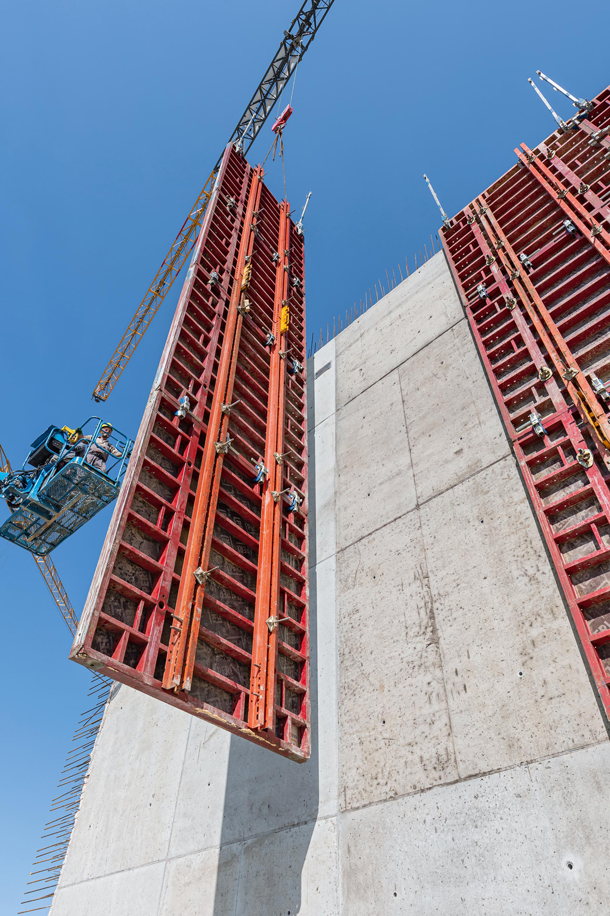 Das PERI Konzept basiert auf großflächigen Umsetzeinheiten, die mit jeweils nur einem Kranhub ohne aufwendige Montage- und Demontagearbeiten versetzt werden können. Geeignete Grundlage hierfür sind das MAXIMO Wandschalungssystem und der VARIOKIT Ingenieurbaukasten, ergänzt durch den PERI UP Gerüstbaukasten. Die Ausbildung der 11 m hohen Bewehrungsgerüste und Gerüsttreppentürme als kranversetzbare Gerüsteinheiten ist bei PERI UP unter Verwendung zugfester Verbindungen und entsprechender Basisverbereiterungen problemlos möglich. Auch die 10,80 m hohe Schließschalung wird großflächig umgesetzt. Integrierte Stahlriegel des VARIOKIT Baukastensystems sorgen für zusätzliche Stabilität der aufgestockten MAXIMO Elemente, insbesondere beim Ablegen und Anheben zum Zwischenlagern, Säubern und Auftragen des Trennmittels. Die einseitig bedienbare MX Ankertechnik und das einhändig bedienbare Richtschloss BFD bringen insbesondere bei den großen Schalungshöhen zusätzliche, wertvolle Zeitvorteile.