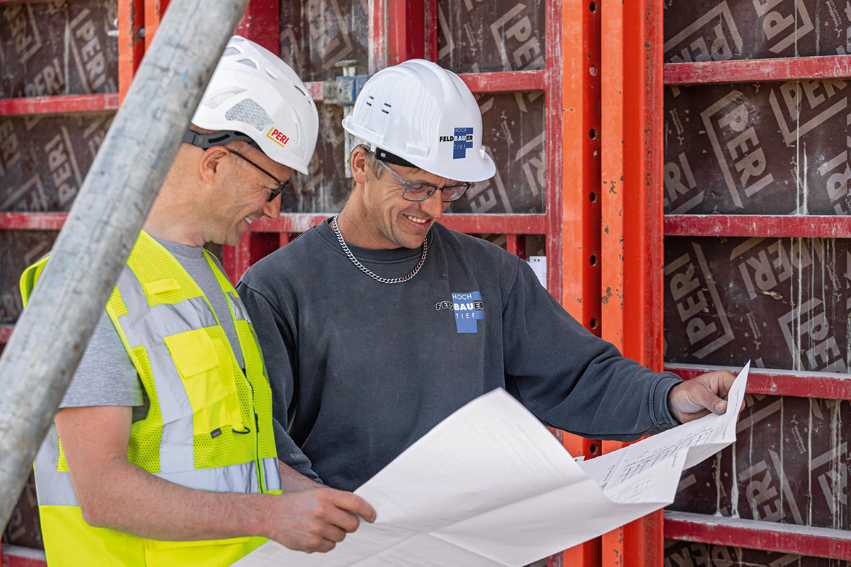 Exakt an die besonderen Baustellenbedürfnisse angepasst, erarbeiteten PERI Ingenieure der Niederlassung Nürnberg das Schalungs- und Gerüstkonzept unter Berücksichtigung des firmeneigen vorhandenen Materialbestands. Notwendige Systembauteile zur Vervollständigung der Umsetzeinheiten konnten projektbezogen einfach hinzugemietet werden. Gleich zu Beginn der Baumaßnahme unterstützte der PERI Fachberater mit hilfreichen Tipps und Tricks auf Basis seiner langjährigen Erfahrung. Die Kombination aus Vorplanung und Baustellensupport ermöglichte eine fachgerechte Erstmontage der Schalungseinheiten.