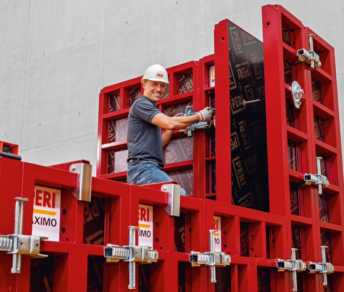 Die Elemente der Maximo-Rahmenschalung werden stehend oder liegend für das Schalen von Wänden bei kleinen und einfachen bis zu anspruchsvollen Großobjekten eingesetzt. Auch bei Maximo folgt Peri dem Grundprinzip: Je weniger Bauteile ein System hat und je weniger Fehler bei der Bedienung entstehen können, desto schneller geht die Arbeit voran. Fachkräfte haben das passende Arbeitsmaterial auf der Baustelle schneller parat und falsche Anwendungen werden ausgeschlossen. Diesen Ansatz führt Peri auch bei der Wandstärkeneinstellung, beim Auf- und Abstocken oder beim Ausbilden von Ecken fort. Dazu kommen ein laut Hersteller einfach und sicher montierbares Konsolensystem sowie Systemergänzungen. Zudem wird generell so viel wie möglich am Boden vormontiert, um unnötige Absturzrisiken in der Höhe zu vermeiden.