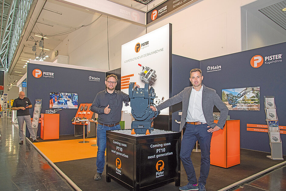 Der auf der Bauma 2019 erstmals vorgestellte Tiltrotator PT 10 des Fluidtechnikspezialisten Pister aus dem nordbadischen Muggensturm ist jetzt in einer überarbeiteten Version präsentiert worden, gemeinsam mit der in Marktoberdorf (Ostallgäu) ansässigen Industrievertretung Hain als Vertriebs- und Servicepartner von Pister-Kugelhähnen und Multikupplungssystemen. »Die erste Serie war gut, aber nicht gut genug«, sagte Geschäftsführer Dominick Hain im Gespräch mit dem bauMAGAZIN, und Pister-Geschäftsführer Johannes Späth ergänzte: »Wir haben unser Lehrgeld bezahlt.« Vor allem der Hydraulikmotor ist jetzt wesentlich leistungsstärker und damit auch größer dimensioniert. Zudem ist der neue PT 10 jetzt wesentlich robuster als das Vorgängermodell und dadurch auch zuverlässiger. Exklusiver Vertriebspartner für den PT 10, der für Bagger mit einem Einsatzgewicht von 7 t bis 10 t konzipiert wurde, ist wie bisher Wilhelm Schäfer, der Generalimporteur des japanischen Kompaktbagger-Spezialisten Takeuchi. Allerdings wird es auf jeden Fall noch bis zum zweiten Quartal des kommenden Jahres dauern, bis der PT 10 auf den Markt kommt. »Wir wollen Schritt für Schritt zusammen mit Wilhelm Schäfer in die Breite gehen«, so Johannes Späth weiter, »und das braucht seine Zeit und diverse Feldversuche.« t