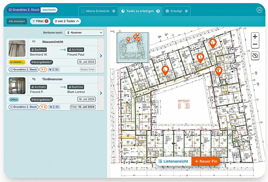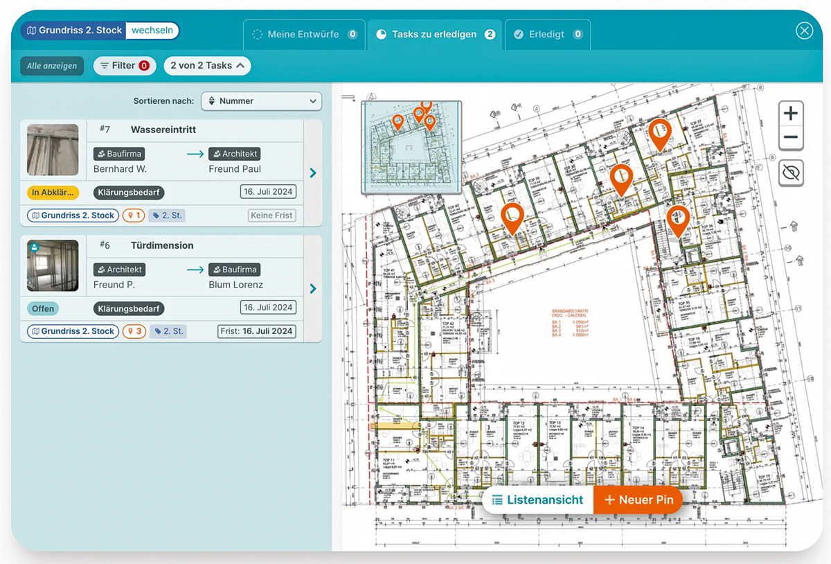 Mängel frühzeitig zu erkennen und sauber zu dokumentieren, ist entscheidend für eine erfolgreiche Bauabwicklung. Mit »Planfreds« digitalem Mängelmanagement können Bauherren bzw. deren beauftragte Architekten direkt auf der Baustelle Mängel erfassen, mit Fotos sowie Kommentaren versehen und gezielt an die zuständigen Parteien weiterleiten. Das gelinge durch mobile Erfassung, Verortung auf Bauplänen sowie automatische Benachrichtigungen und Statusverfolgung. Das spare laut »Planfred« Zeit, minimiere Risiken und sorge für eine lückenlose