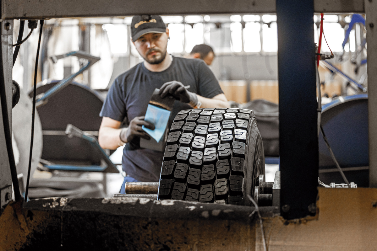 Da die Anschaffung von Reifen erhebliche Investitionen darstellt, sollte die Lebensdauer möglichst lang sein. Hier kommen die Runderneuerungswerke der Pneuhage-Gruppe ins Spiel: Die dort angewandte Technik erhält rund 80 % eines Lkw-Reifens und macht damit Runderneuerte zu einem echten Gewinner, wenn es um Nachhaltigkeit und Umweltschutz geht. Je nach Wertigkeit und Zustand können gebrauchte Reifen durch hochwertige Produktionsverfahren bis zu zwei Mal erneuert werden und somit ihre Nutzungsdauer deutlich erweitern. Das Ganze bedeutet in Zahlen: Pro runderneuertem Lkw-Reifen der Größe 315/80R22.5 können im Vergleich zur Neureifenproduktion bis zu 70 l Rohöl, 32 kg Gummi sowie 14 kg Stahl eingespart werden. Außerdem braucht der Prozess etwa 50 % weniger Energie und bis zu 80 % weniger Wasser – ein gewichtiges, ökologisches Argument, das für den Einsatz von runderneuerten Reifen auf Baustellen spricht.