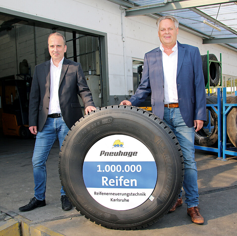 Runderneuerte Reifen für Lkw können durch allgemeine Kostenvorteile und Nachhaltigkeit punkten. Nach Erfahrungen der Karlsruher Pneuhage-Gruppe nehmen mehr und mehr Flotten die Entlastung der Umwelt in den Lieferketten ernst. Neben der Anschaffung sparsamer Fahrzeuge bietet sich dafür der Einsatz runderneuerter Reifen an. In fünf eigenen Werken bringt die Pneuhage-Gruppe jährlich rund 100 000 Lkw‐Reifen wieder auf die Straße. Das Karlsruher Team der Pneuhage-Reifenerneuerungstechnik kann dabei auf eine besondere Leistung blicken: 1 000 000 erneuerte Lkw‐Reifen seit Inbetriebnahme des Standorts im Jahr 1988. Der Jubiläumsreifen konnte im Oktober an Gerhard Lang Recycling aus Gaggenau übergeben werden. Für den langjährigen Kunden kommt das Winterprofil für den Einsatz am Fuße des Schwarzwaldes gerade richtig. t