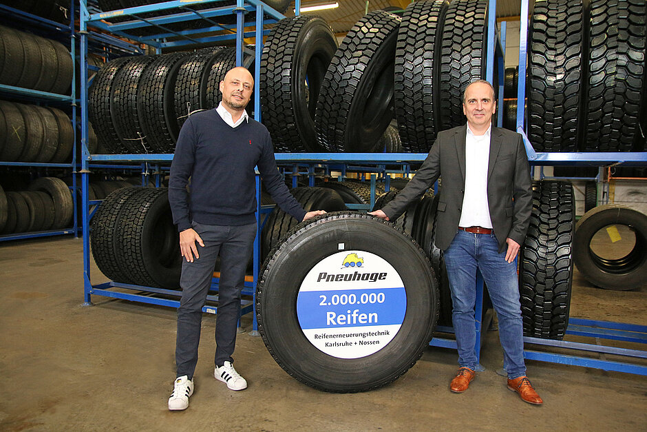 Die beiden Werke der Pneuhage Reifenerneuerungstechnik in Karlsruhe und Nossen konnten im Laufe des Jahres 2023 die Schwelle von zwei Millionen erneuerter Reifen für Lkw, Bus, Auflieger oder Anhänger überschreiten. Mit der bis heute laufenden Zählung der Stückzahlen an qualitativ hochwertigen Runderneuerungen in Größen von 17,5 Zoll bis 22,5 Zoll begann man 1988. Damals startete die Produktion im neu gebauten Fertigungsbetrieb am Firmensitz an der Rossweid in Karlsruhe. In Nossen bei Dresden eröffnete 1991 nach der Wende ein weiterer Betrieb, der 1993 dort ebenfalls einen Neubau bezog. Die über 50 Beschäftigten der Pneuhage Reifenerneuerungstechnik GmbH fertigen seit 2001 im Kalterneuerungsverfahren in Lizenz von Recamic jährlich rund 70 000 Reifen. Verkaufsleiter Björn Tischer betont: »Beim Fertigungsprozess können wir uns auf gute Ausbildung, umfangreiches Know-how sowie die Expertise erfahrener Vulkaniseur-Meister verlassen. Unsere Kunden vertrauen darauf, einwandfreie Karkassen mit hochwertigen Profilen zu erhalten, deren Eigenschaften denen von Neureifen in nichts nachstehen.«