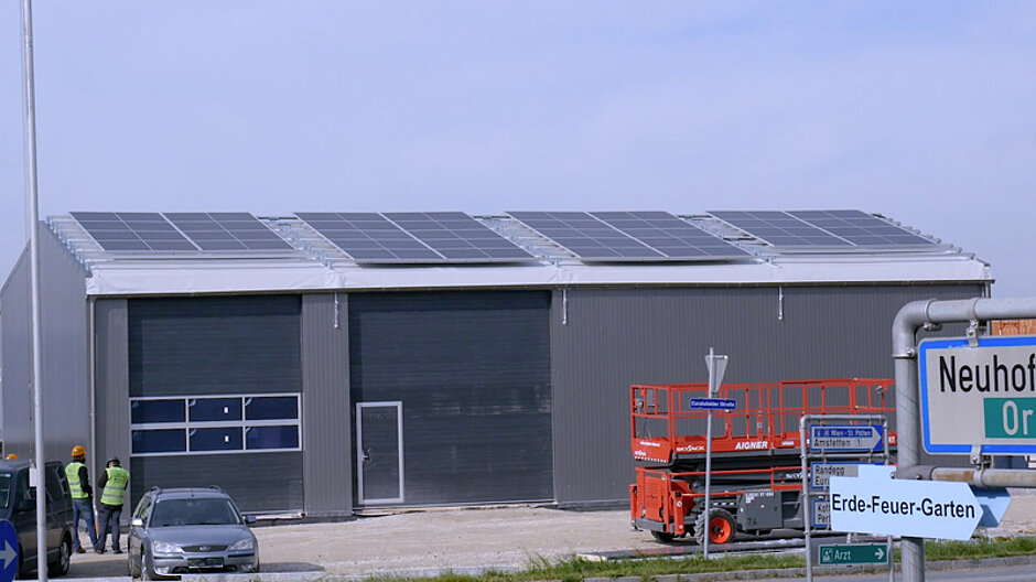 Die isolierte Halle mit Sandwichplatten-Wandverkleidung wurde in wenigen Tagen für einen österreichischen Kunden gebaut und wird als Autowerkstatt mit dem Bürobereich dienen. Die Photovoltaikanlage mit der Leistung von beinahe 15 kWp wird die Versorgung für die Werkstattausrüstung, die Heizung und Beleuchtung der Halle sicherstellen.