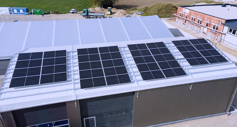 Die Konstruktion der 10x20x4,2m großen Zelthalle basiert auf Aluminiumprofilen und wurde sowohl an die lokalen Schnee- und Windlasten als auch an die zusätzliche Belastung mit den Photovoltaik-Modulen angepasst. Die photovoltaischen Module wurden auf einer speziellen Konstruktion über dem Dach aus PVC-Gewebe installiert.