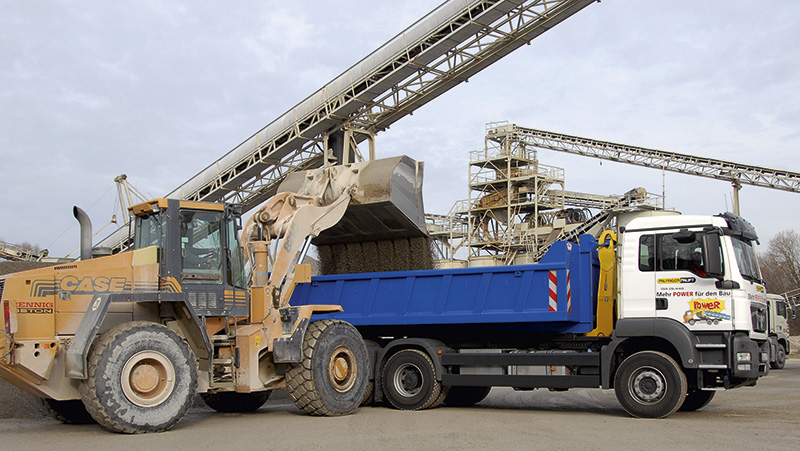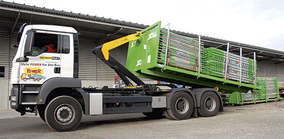 Die Einsatzbereiche für den Power sind in der Tat ein weites Feld. Ob als Pritsche oder Kipper, ob als Plateau-, Kran- oder Recyclingfahrzeug: Dadurch, dass der Power unterschiedlichste Behältertypen und Behälterlängen aufnimmt, bietet er eine Vielzahl an Möglichkeiten für die Baustellenlogistik. Schüttgut wie Sand, Kies oder Abraum, Maschinen und Geräte aller Art oder Baustoffe, Schalungen und Gerüstmaterialien – als Transportfahrzeug ist der Power-Abrollkipper nahezu universell einsetzbar. »Der Power kann im Prinzip den kompletten Transportbereich in der Baubranche abdecken«, sagte Vordermayer.Aufgrund seiner Multifunktionalität biete der Power eine große Zeitersparnis und spare dadurch Kosten, so Vordermayer. »Wartezeiten für den Fahrer reduzieren sich, weil die Beladung der Behälter nach den Anforderungen auf der Baustelle organisiert werden kann. Mit dem Power kann man morgens Maschinen und Geräte anliefern, anschließend ein Gerüst oder Schalungen transportieren und nachmittags Schüttgut fahren.« Bei der Vorführung eines Power mit einer Hubkraft von 20 t durch die Hofner Hebetechnik GmbH (Gersthofen), Vertriebspartner von Palfinger im Großraum Augsburg, demonstrierte Geschäftsführer Pius Hofner die Multifunktionalität des Abrollkippers eindrucksvoll: Nach dem Transport eines Staplers wurde ein 3,5 t-Bagger von Yanmar aufgeladen, anschließend bestand die Ladung aus Gerüstmaterial und zu guter Letzt zeigte der Power im Kieswerk, dass er als Schüttgut-Transporter beste Dienste leistet – und das alles innerhalb von wenigen Stunden. »Für einen Bauunternehmer ist diese flexible Einsetzbarkeit meiner Meinung nach die ideale Lösung«, sagte Hofner.Mit entscheidend sei dabei die ausgefeilte Armgeometrie, mit der eine wesentlich höhere Hubleistung erreicht werde als bei herkömmlichen Geräten. »Aufgrund der Zylinderstellung kann die Kraft besser ansetzen«, sagte Vordermayer. Dadurch werde der Behälter in einem sehr flachen Aufnahmewinkel aufgezogen, was wiederum dafür sorge, dass die Ladung nicht verrutsche und problemlos zu transportieren sei. Ein weiterer Vorteil der Technologie sei, dass der Verschleiß am Gerät minimiert werde, weil das ganze System aufgrund der Armgeometrie nicht so beansprucht werde. »Durch die Gelenke werden drehende Bewegungen und keine Schubbewegungen erzeugt, weshalb deutlich geringere Reibungskräfte auftreten.« Auch die hydraulischen Bauteile würden nicht so stark belastet, weil der Power mit einem wesentlich niedrigeren Betriebsdruck arbeite als herkömmliche Teleskop-Abrollkipper. Zudem ermögliche es der Power, die Behälter bei beengten Platzverhältnissen sowie bis zu 0,9 m unter Fahrzeugniveau aufzunehmen. Dabei sorge der Universal-Haken mit pneumatischer Hakensicherung für ein leichtes und schnelles Einfädeln in den Behälterbügel, ohne dass dafür der Lkw bewegt werden müsse. Als komplettes Montageset kann das Power-System auf jedes Chassis aufgebaut werden.