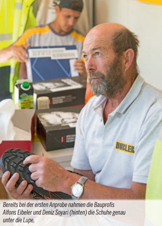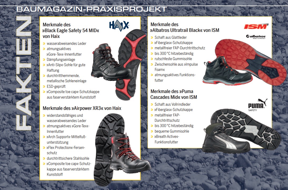 Herstellern ausgewählt, um sie unter realen Baustellenbedingungen tragen zu lassen. Der Schuhspezialist Haix schickte seinen »Black Eagle Safety 54« sowie den »Airpower XR3« ins Rennen, während Steitz Secura mit den Modellen »VD 3800 B SST SF« und »VX 7600 PERB S3« vertreten war. Bei BIG Arbeitsschutz standen von der Marke Runnex der »TeamStar 5310« sowie der »LightStar 5321« im Mittelpunkt. Für ISM durften hingegen der »Cascades« von Puma und der »Ultratrail Black« von Albatros ran. Übrigens: Mehrere Hersteller baten darum, vorab Fußmessungen durchzuführen, damit die Schuhe die optimale Größe haben und auf die individuellen Bedürfnisse des Trägers abgestimmt sind. Grundsätzlich gilt, dass diese Maßnahme für jeden Anwender zu empfehlen ist, da mögliche Komplikationen oder Minderungen für den Tragekomfort vermieden werden. Um anderen Herstellern jedoch keinen Vorteil bei der Beurteilung zu bieten, hat das bauMAGAZIN bei diesem Projekt grundsätzlich auf die Vermessung verzichtet. Bedanken möchte sich die Redaktion an dieser Stelle bei den Herstellern dafür, dass sie ihre Sicherheitsschuhe kostenlos zur Verfügung gestellt haben, und bei dem vierköpfigen Team des Allgäuer Bauunternehmens Dobler. Die vier Tester trugen die Schuhe insgesamt acht Wochen lang und sind dabei nicht gerade zimperlich mit ihnen umgegangen.