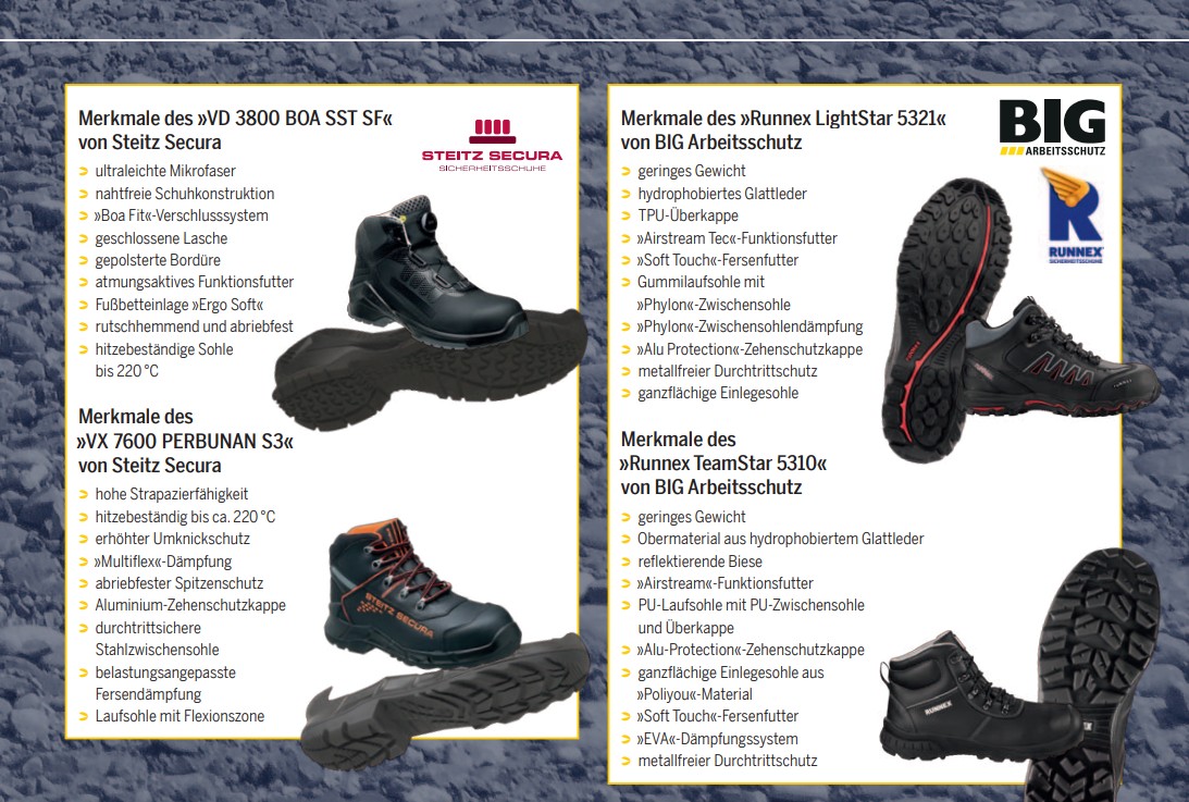 Der menschliche Fuß ist ein häufig unterschätztes Meisterwerk: Er besteht aus 27 Gelenken, 26 Knochen, 107 Bändern sowie 1 700 Nervenenden und stellt damit eine hochkomplexe Konstruktion dar, die besonders gut geschützt werden muss – gerade auf Baustellen. Denn abseits der ohnehin schon hohen Belastung durch ständiges Stehen und Laufen auf unebenem Grund ist der Fuß vielen Gefahren ausgesetzt. Neben Stolper-, Rusch- oder Sturzunfällen besteht die Gefahr, dass schwere Teile herabfallen oder spitze Gegenstände durch die Schuhsohle dringen. Umso wichtiger ist das Tragen von Sicherheitsschuhen – in der Baubranche ein wichtiger Bestandteil der persönlichen Schutzausrüstung (PSA) und gleichzeitig notwendige Pflicht. Allein damit ist es aber nicht getan. Ein Sicherheitsschuh muss weit mehr können als „nur“ zu schützen. Im Rahmen unseres großen bauMAGAZIN-Praxisberichts haben die Bauprofis Jürgen Martin (Polier, 49 Jahre), Alfons Eibeler (Kranfahrer, 60 Jahre), Deniz Soyari (Facharbeiter, 19 Jahre) und Mario Gutsfeld (Facharbeiter, 40 Jahre) mehrere Sicherheitsschuhe einem umfangreichen Stresstest unterzogen, um herauszufinden, was die neuesten Schuhentwicklungen „tatsächlich auf dem Kasten haben.“ Ein großer Dank gilt in diesem Zusammenhang den Herstellern Steitz Secura, Haix, BIG Arbeitsschutz (Runnex) und ISM (Puma/Albatros), die diese Herausforderung nicht gescheut und jeweils zwei Modelle zur Verfügung gestellt haben. Das bauMAGAZIN präsentiert Ihnen nun vier Hersteller, acht Sicherheitsschuhe und eine erfahrene Baustellen-Truppe, die mit viel Engagement, aber auch großem Interesse an das Projekt herangetreten ist. Und eines schon mal vorweg: Inmitten von Staub, Beton und Metallstreben mussten die Schuhe nicht nur acht harte Arbeitswochen, sondern auch höchst kritische Bauprofis über sich ergehen lassen.