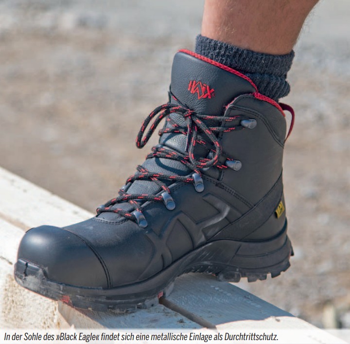 Und damit spricht Deniz Soyari einen wichtigen Punkt an. Im Winter oder Frühling kann es auf der Baustelle schnell ungemütlich, aber eben auch gefährlich werden. Regen, Eis und Schnee sorgen für rutschige Flächen. Ein Sicherheitsschuh sollte daher nicht nur robust sein, sondern auch einen festen Tritt ermöglichen. Laut Haix sorgt dafür eine spezielle Gummi-PU-Sohle, die einerseits ein rutschhemmendes, andererseits aber auch ein abriebfestes Profil aufweist. Wichtig ist das Angaben des Herstellers zufolge aber nicht nur für Beschäftigte am Boden: Auch und gerade bei Arbeiten auf dem Dach seien Stolper-, Rutsch- und Sturzunfälle keine Seltenheit. Begrüßt hat der Tester außerdem die gute Schutzfunktion: »Das fühlt sich insgesamt stabil und wertig an, ohne dass der Schuh dadurch ein zu hohes Gesamtgewicht hat.« Ausgestattet ist das Modell mit einer Schutzkappe aus ultraleichtem faserverstärkten Kunststoff sowie einer durchtritthemmen-den Sohle. Letztere ist metallisch, aber trotzdem leicht und flexibel. Sie schützt von unten, damit weder Nägel noch Schrauben oder Scherben auf den Fuß einwirken können. Integriert ist außerdem eine Gore-Tex-Membrane, die den »Black Eagle« laut Haix wasserdicht und auch atmungsaktiv mache. Gleichwohl sorge die Sohle für eine zuverlässige Isolierung gegen Kälte, damit die Füße auch im Winter nicht frieren.