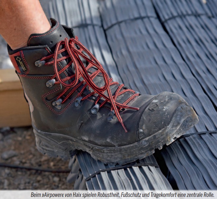 Das zweite Modell von Haix, der »Airpower XR3«, fiel wiederum durch seine vielseitigen Einsatzmöglichkeiten und eine Vielzahl an nützlichen Extras auf. Ebenso wie der »Black Eagle« ist auch der »Airpower« mit einem widerstandsfähigen Außenleder versehen. Eine Besonderheit ist der Durchtrittschutz, den die integrierte Stahlsohle ermöglicht. Im Vergleich zur gewöhnlichen Textilsohle schütze diese laut Hersteller auch gegen spitze Gegenstände und scharfe Kanten. Hinzu komme die hohe Stoßfestigkeit aufgrund der »Composite toe cap«, einer anatomisch geformten Kunststoff-Schutzkappe, die besonders leicht sei und nach einem Aufprall sofort wieder in ihre Ursprungsform zurückkehre, um die Zehen schnell wieder freigeben zu können. Geschützt ist der »Airpower« ebenfalls durch Gore-Tex: So bleibe der Schuh wasserdicht und atmungsaktiv. »Das ist bei uns auf der Baustelle sehr wichtig – nasse Füße werden extrem schnell unangenehm«, betont Alfons Eibeler. Die Gore-Tex-Membran ist dreilagig und findet sich im gesamten Innen