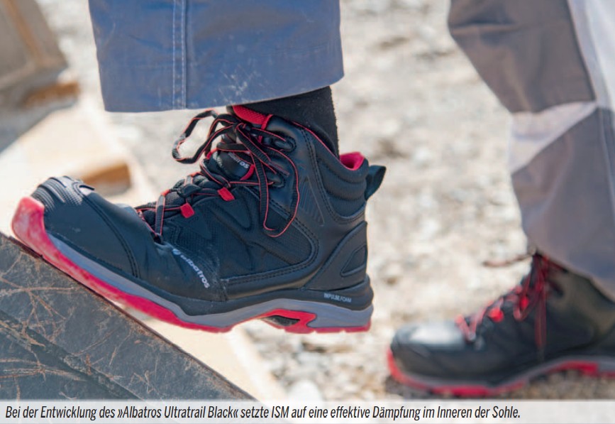 Interessant wird es laut unseres Bauprofis aber auch bei einem Blick auf die Unterseite des Schuhs: Dort finden sich die speziell angeordneten Stollen des Sohlenprofils, um eine gute Traktion auf weichen sowie harten Untergründen zu ermöglichen. Darüber hinaus soll das Sohlenprofil laut ISM verhindern, dass sich Steine oder Schmutz in den Kerben der Sohle festsetzen. Übrigens: Die Sohle ist nach Angaben des Herstellers bis 300° C hitzebeständig, weshalb sich der Schuh auch für viele andere Arbeitsbereiche eignet. Gelobt hat Jürgen Martin den »Ultratrail« darüber hinaus für das angenehme Gesamtgewicht sowie hochwertige Schutzfunktionen: Der Schuh besitzt eine Fiberglaskappe sowie einen metallfreien und flexiblen Durchtrittschutz. Zudem fühle sich die Verarbeitung insgesamt sehr wertig an: »Außen wie innen ist der Schuh gut verarbeitet.« Hergestellt ist das Albatros-Modell aus Vollrindleder mit abriebfesten Textileinsätzen. Kritik gab es hingegen dafür, dass der Schuh nicht komplett wasserdicht sei. Abhängig, so der Tester, sei dies natürlich davon, in welchen Bereichen man auf der Baustelle tätig sei und daher auch die Schuhe nach eben diesen Anforderungen auswähle. Hierzu ergänzt der Hersteller, dass wiederum das Modell »Ultratrail Olive CTX« aus der gleichen Serie mit einem zusätzlichen Funktionsfutter mit wasserdichter sowie atmungsaktiver Membran ausgestattet sei. Last but not least vergibt Jürgen Martin höchste Punktzahlen für das Design: »Der Schuh ist modern, aber insgesamt nicht zu aufdringlich, das gefällt mir sehr gut«, so der Bauprofi.